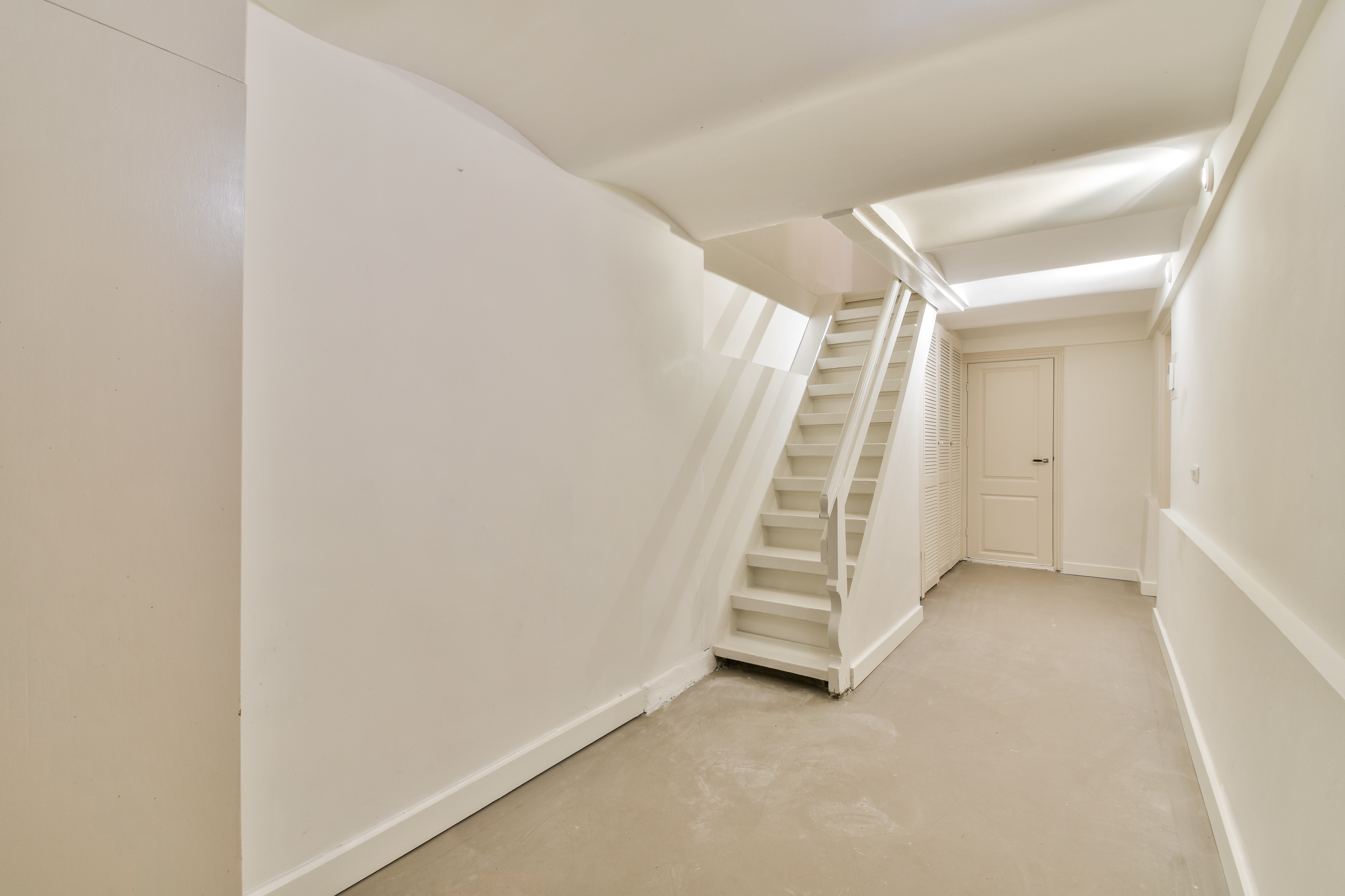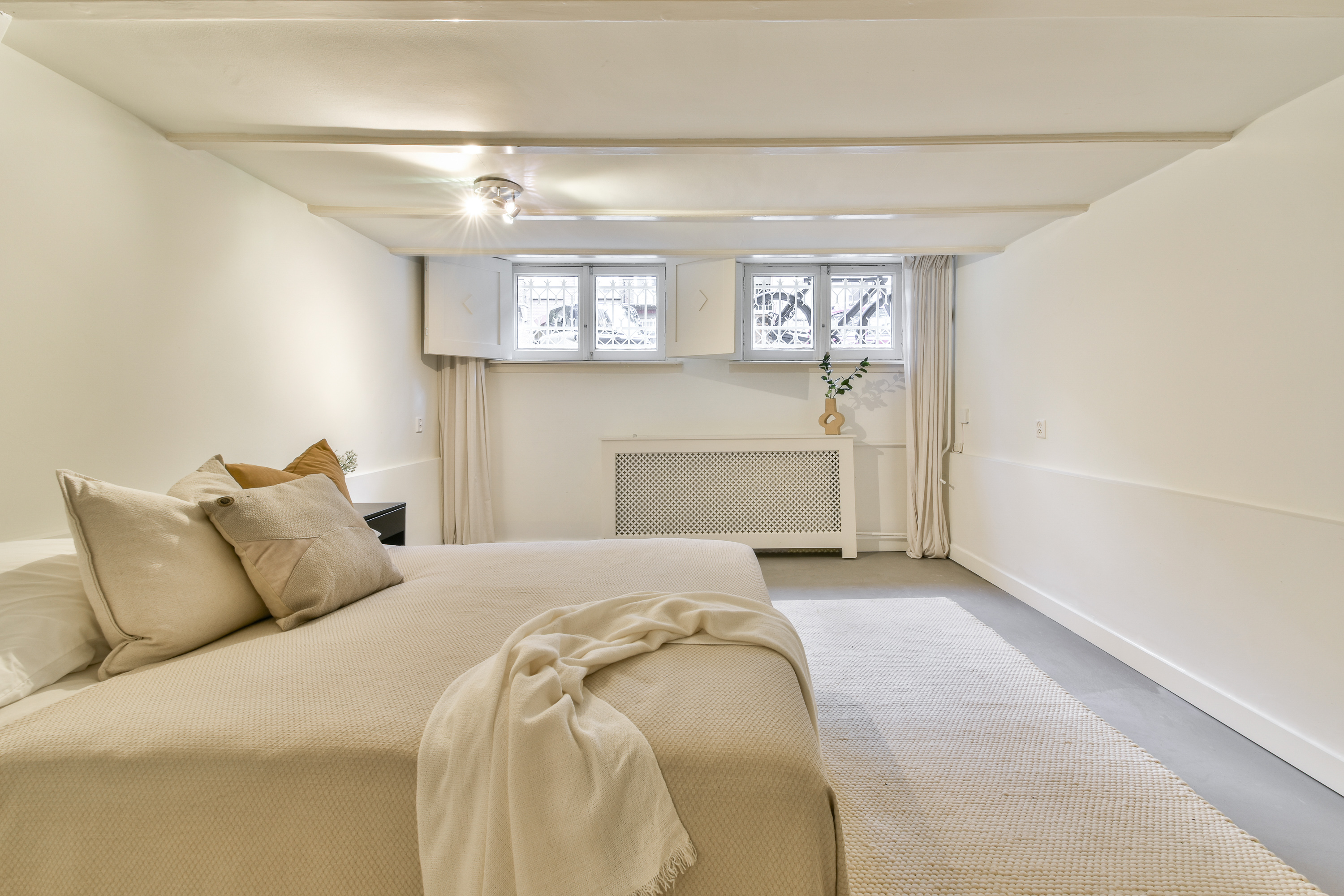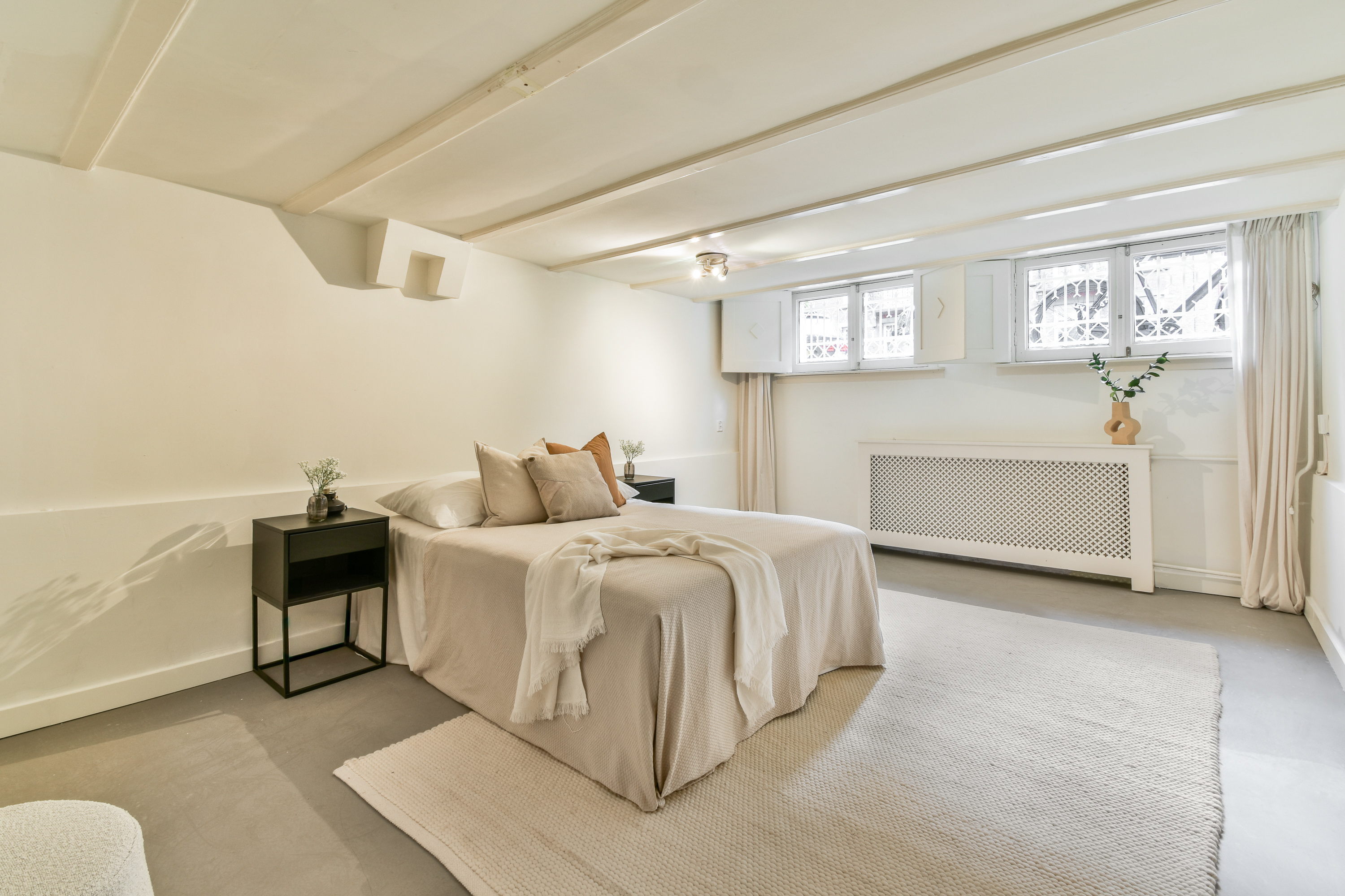An staircase leads to the basement with three good-sized bedrooms. The master bedroom is located on the quiet garden side. The second bedroom is located at the front and is also spacious. The third bedroom is ideal as a children's room, study, or guest room. The modern bathroom is equipped with a bathtub, shower, toilet, double sink, and towel radiators. There is also a separate laundry room with connections for a washing machine and dryer.