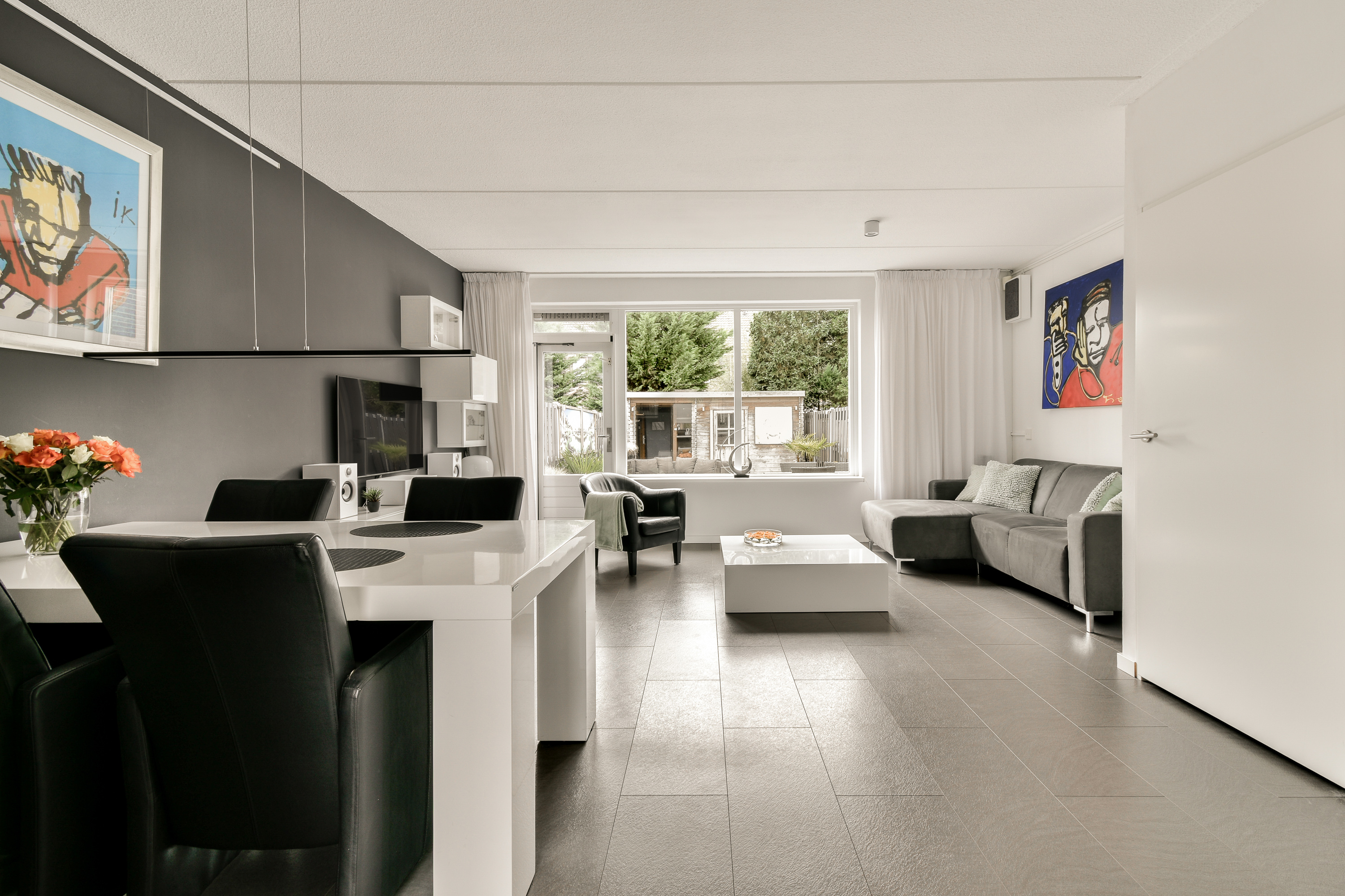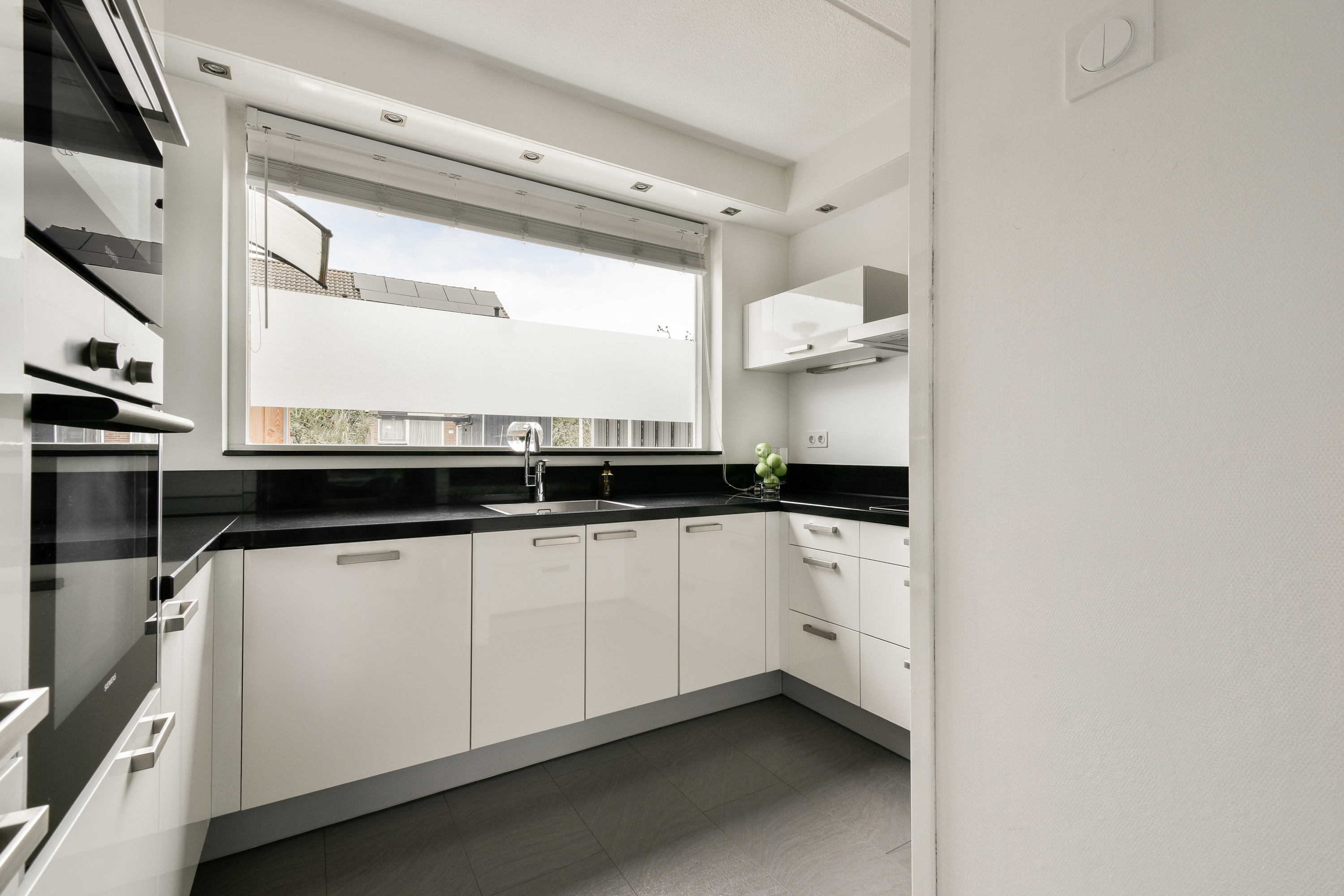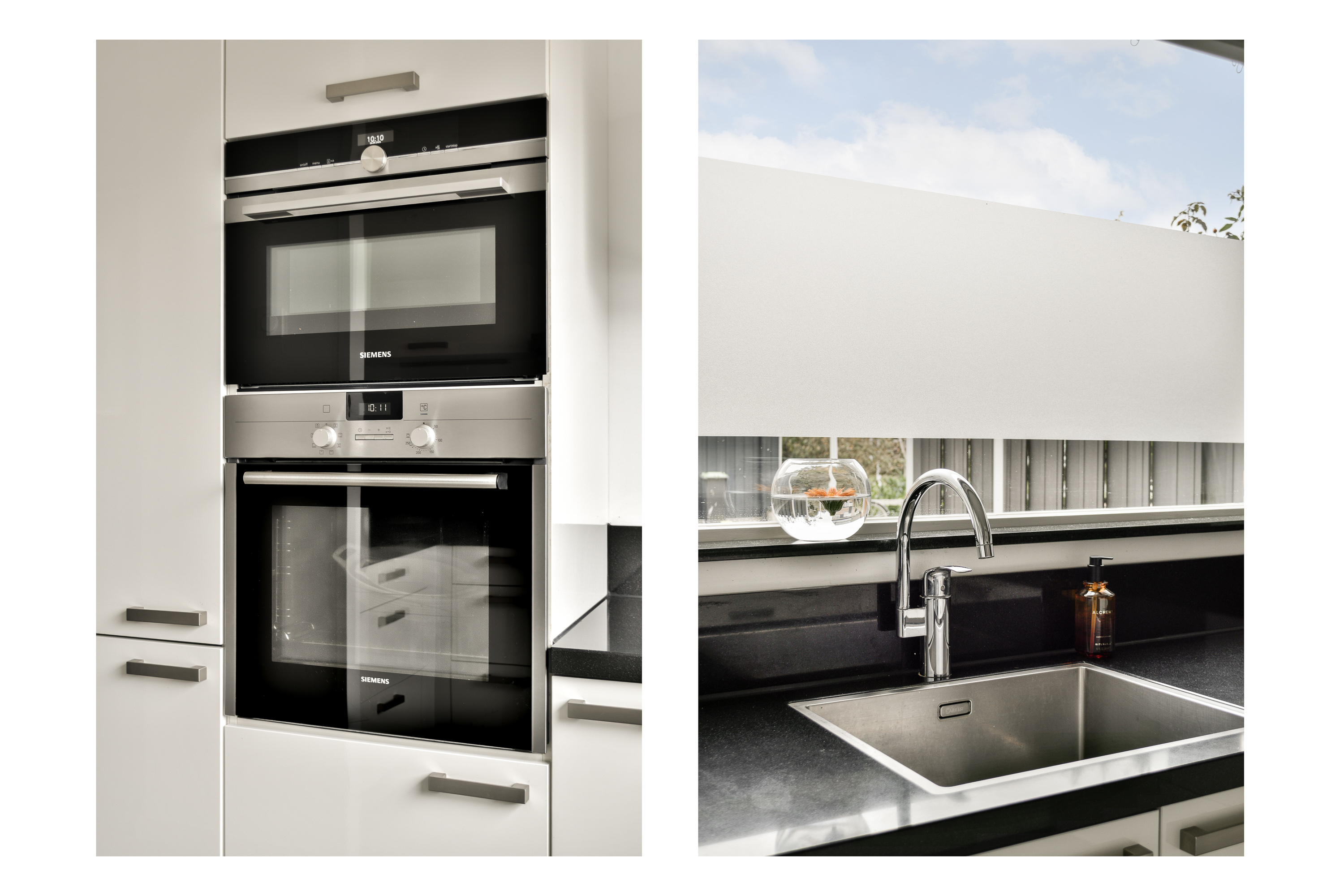 The living room with semi-open kitchen features large windows at the back, offering a lovely view of the sunny garden. There’s plenty of space for both a cosy sitting area and a dining area. At the front of the house, you’ll find the modern U-shaped kitchen, finished in sleek high-gloss white with a dark composite countertop. It's equipped with various built-in Siemens appliances, including an induction hob, extractor hood, fridge, freezer, oven, combi microwave, and dishwasher.