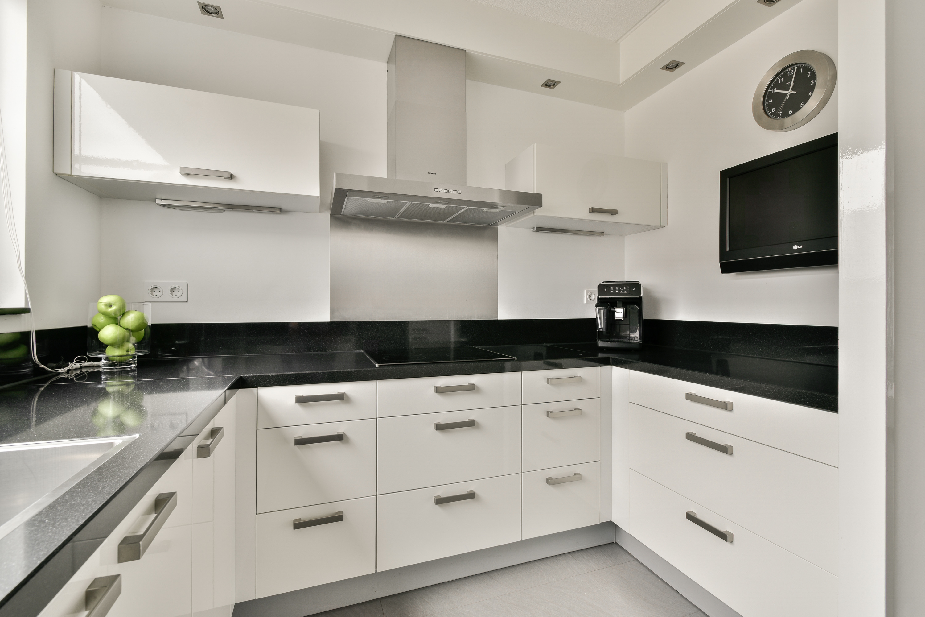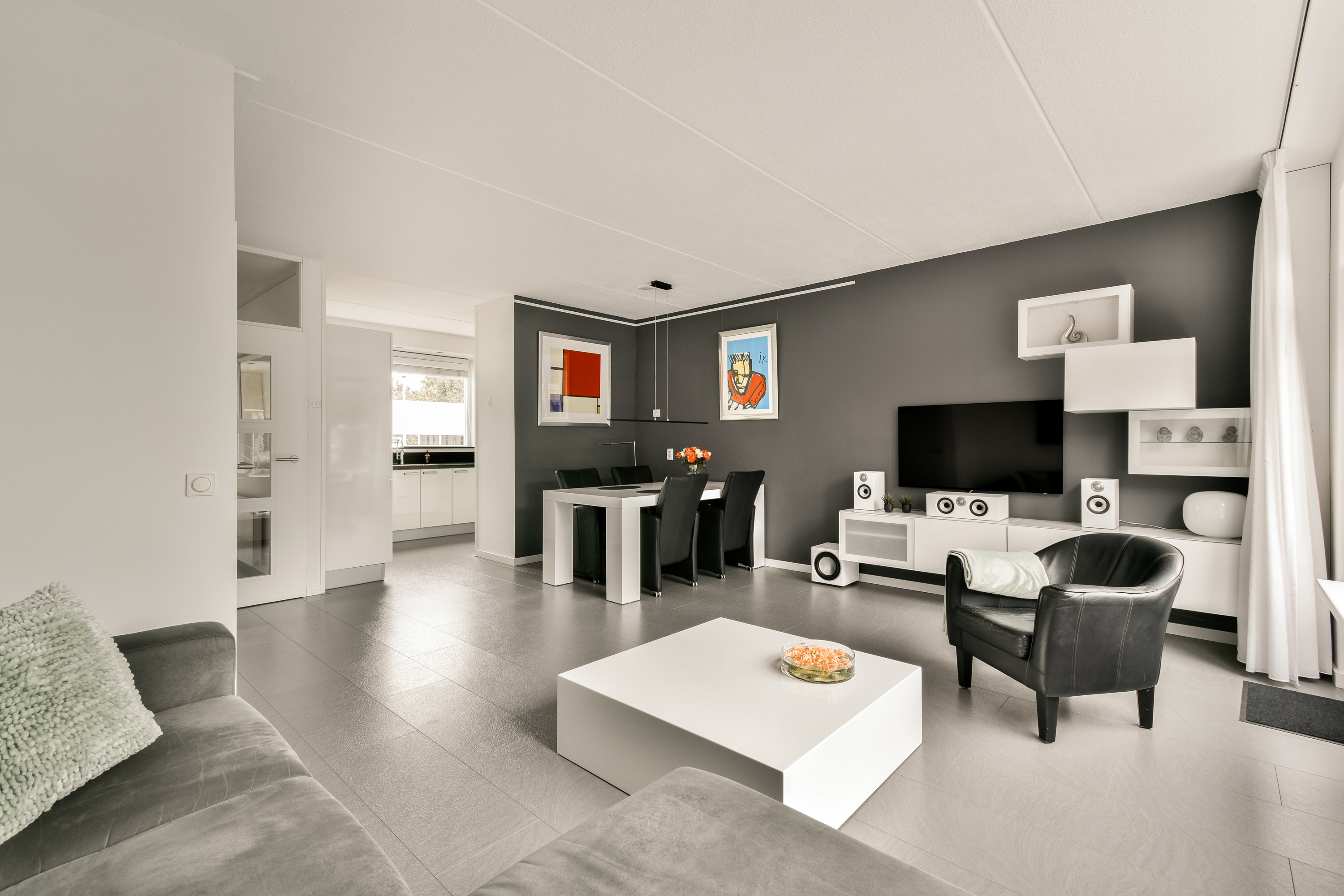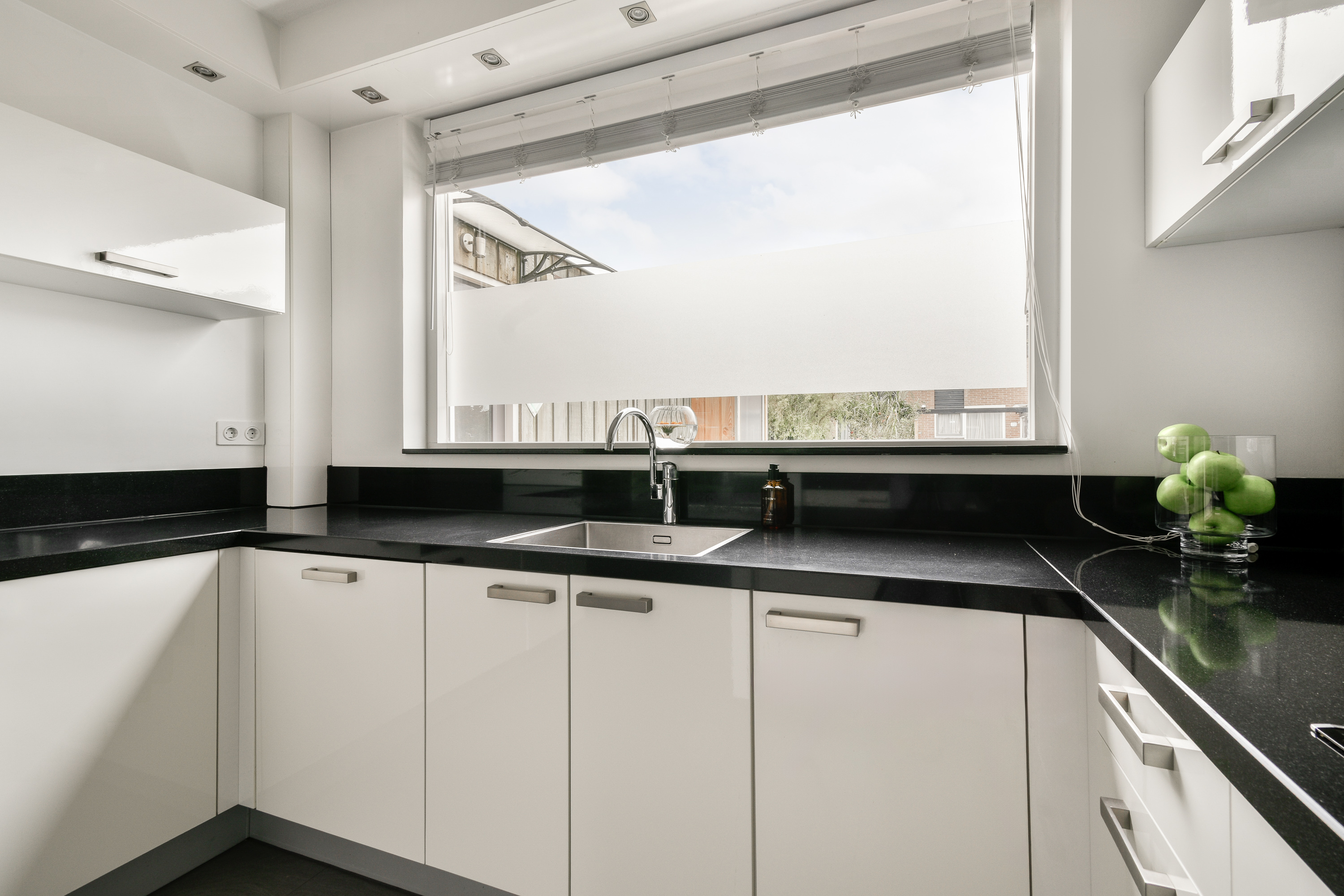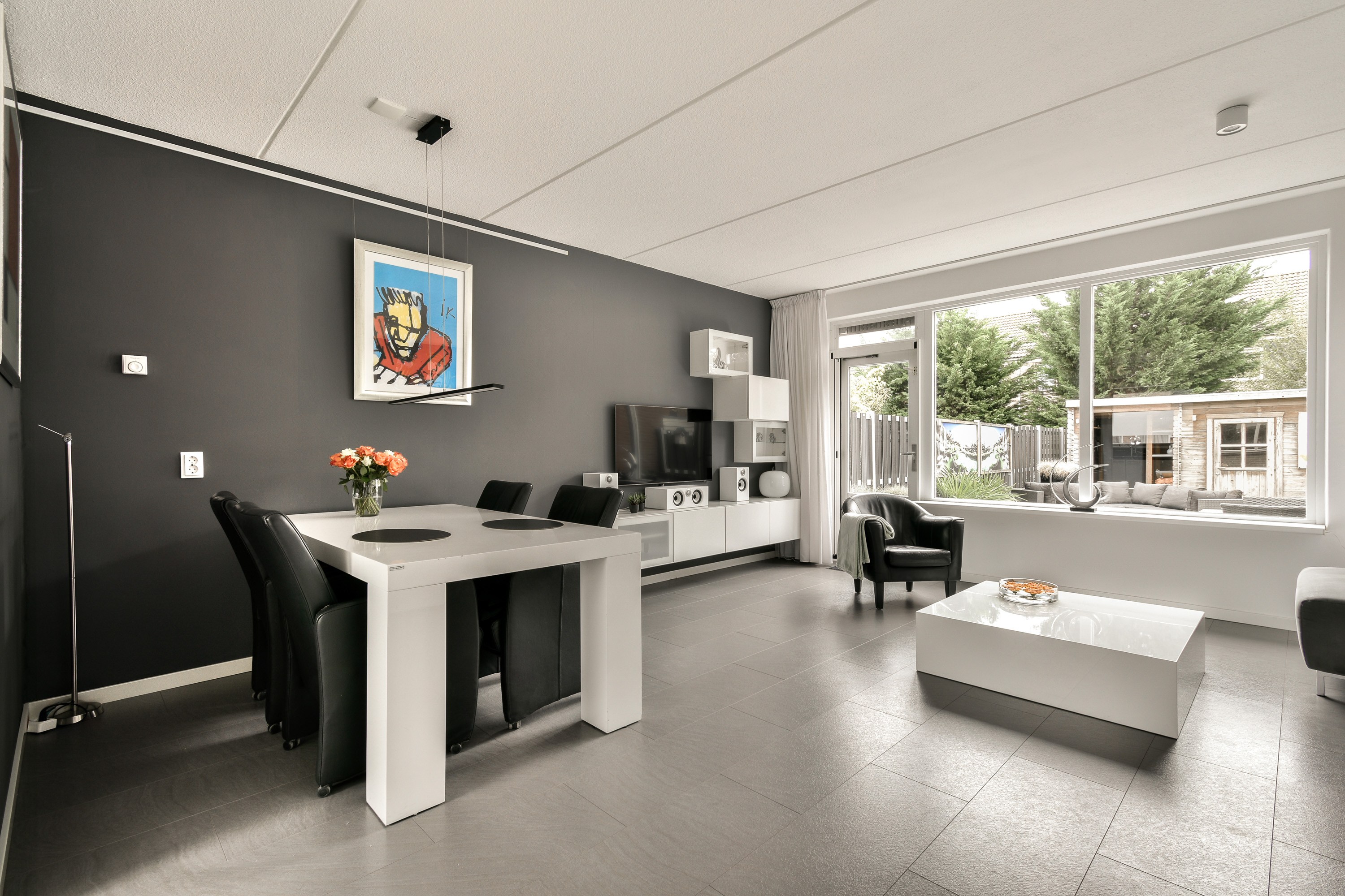The living room with semi-open kitchen features large windows at the back, offering a lovely view of the sunny garden. There’s plenty of space for both a cosy sitting area and a dining area. At the front of the house, you’ll find the modern U-shaped kitchen, finished in sleek high-gloss white with a dark composite countertop. It's equipped with various built-in Siemens appliances, including an induction hob, extractor hood, fridge, freezer, oven, combi microwave, and dishwasher.