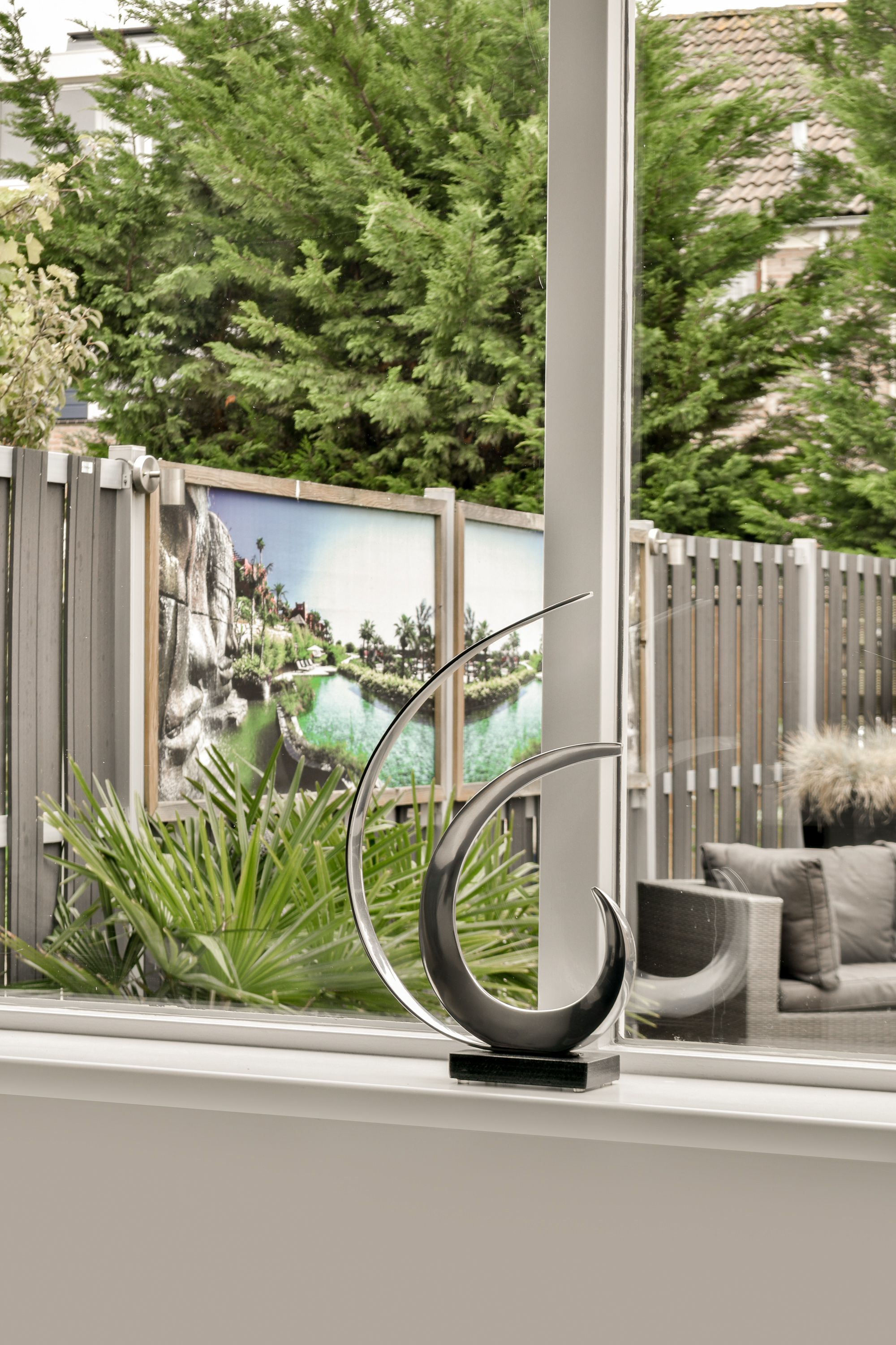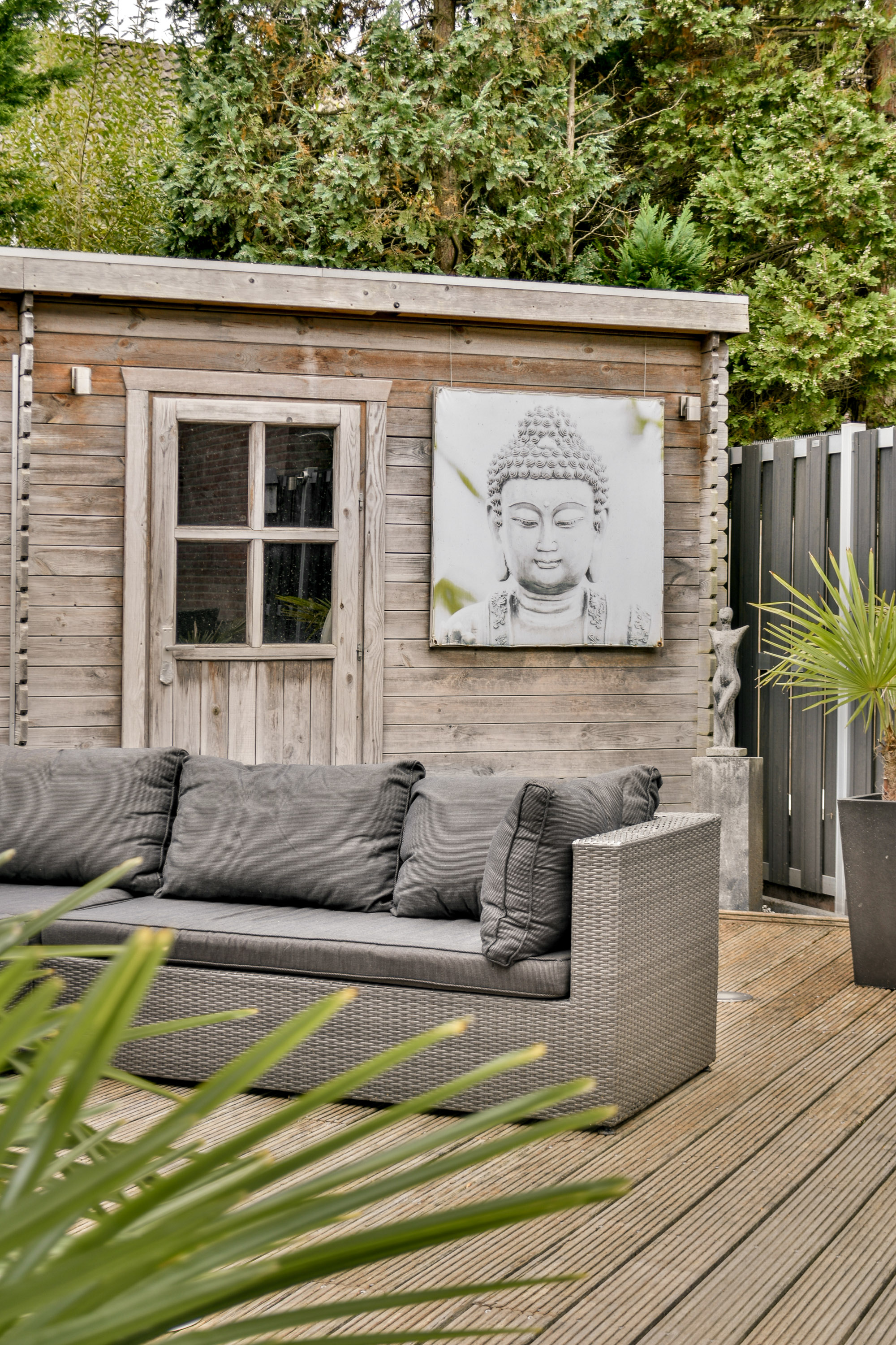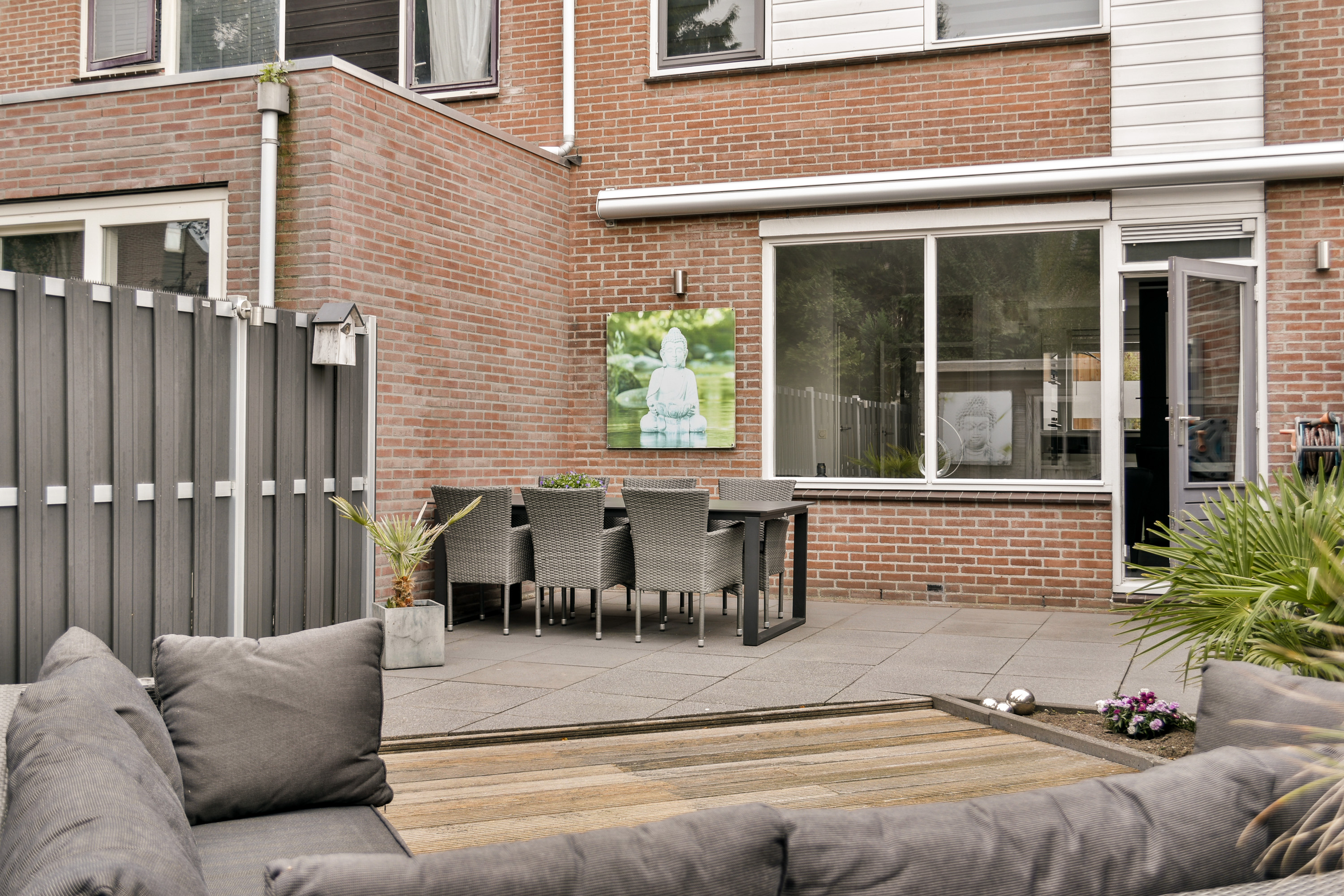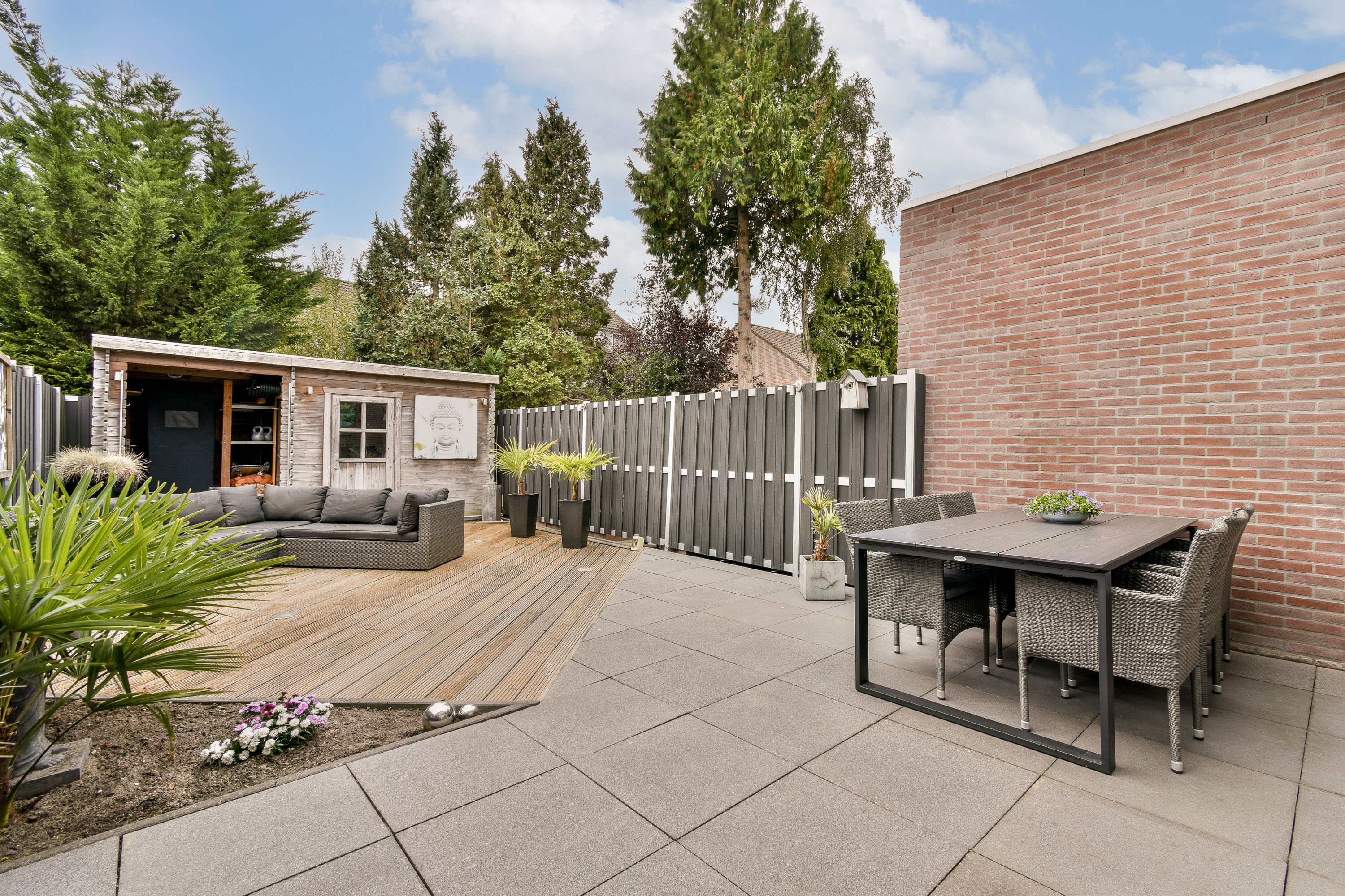 The backyard – approximately 55 m² and southeast-facing – is accessible from the living room. The low-maintenance garden includes an electric sunshade, outdoor tap, modern garden lighting, a shed with an adjacent covered area with electricity and a back entrance.