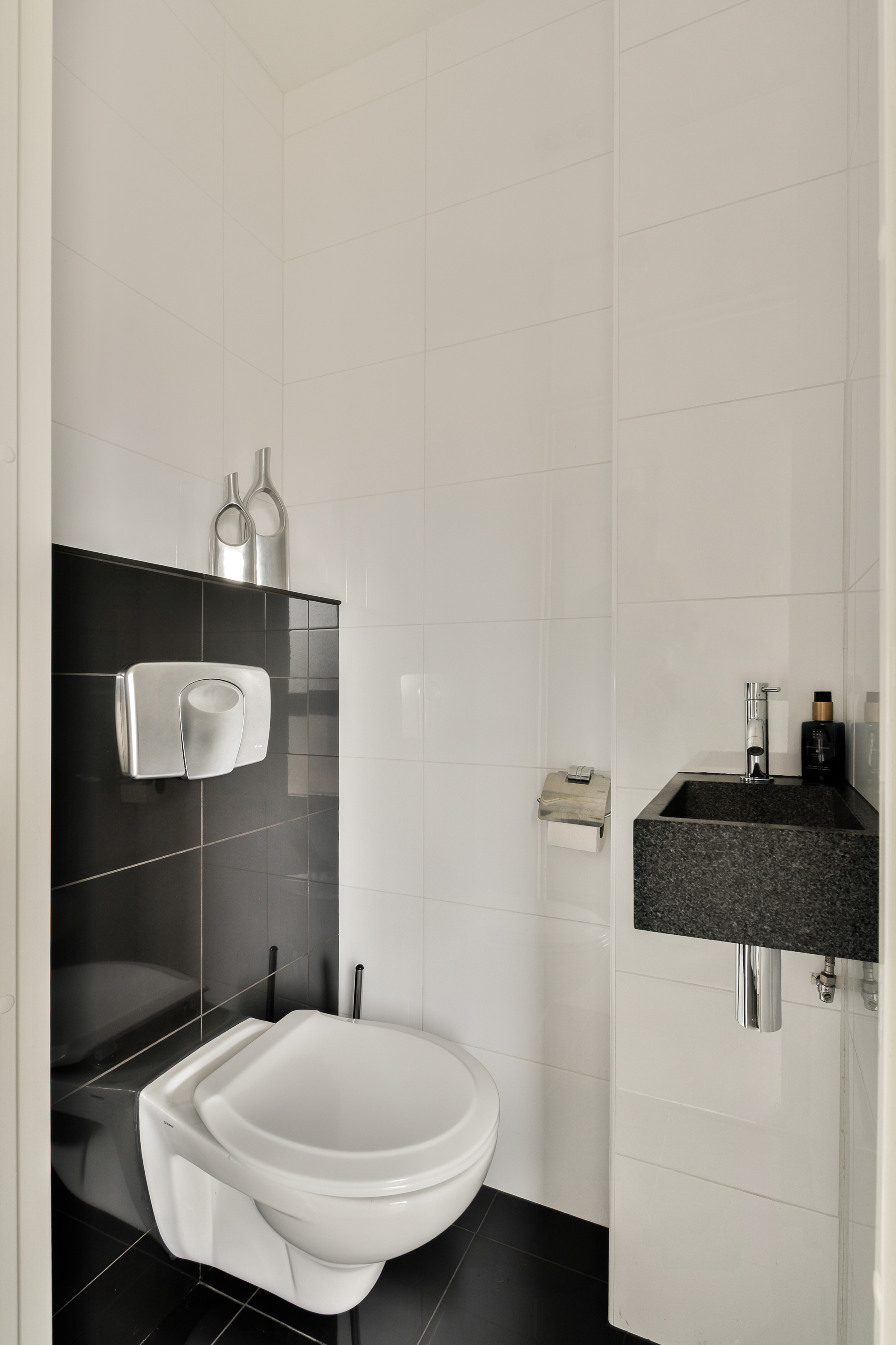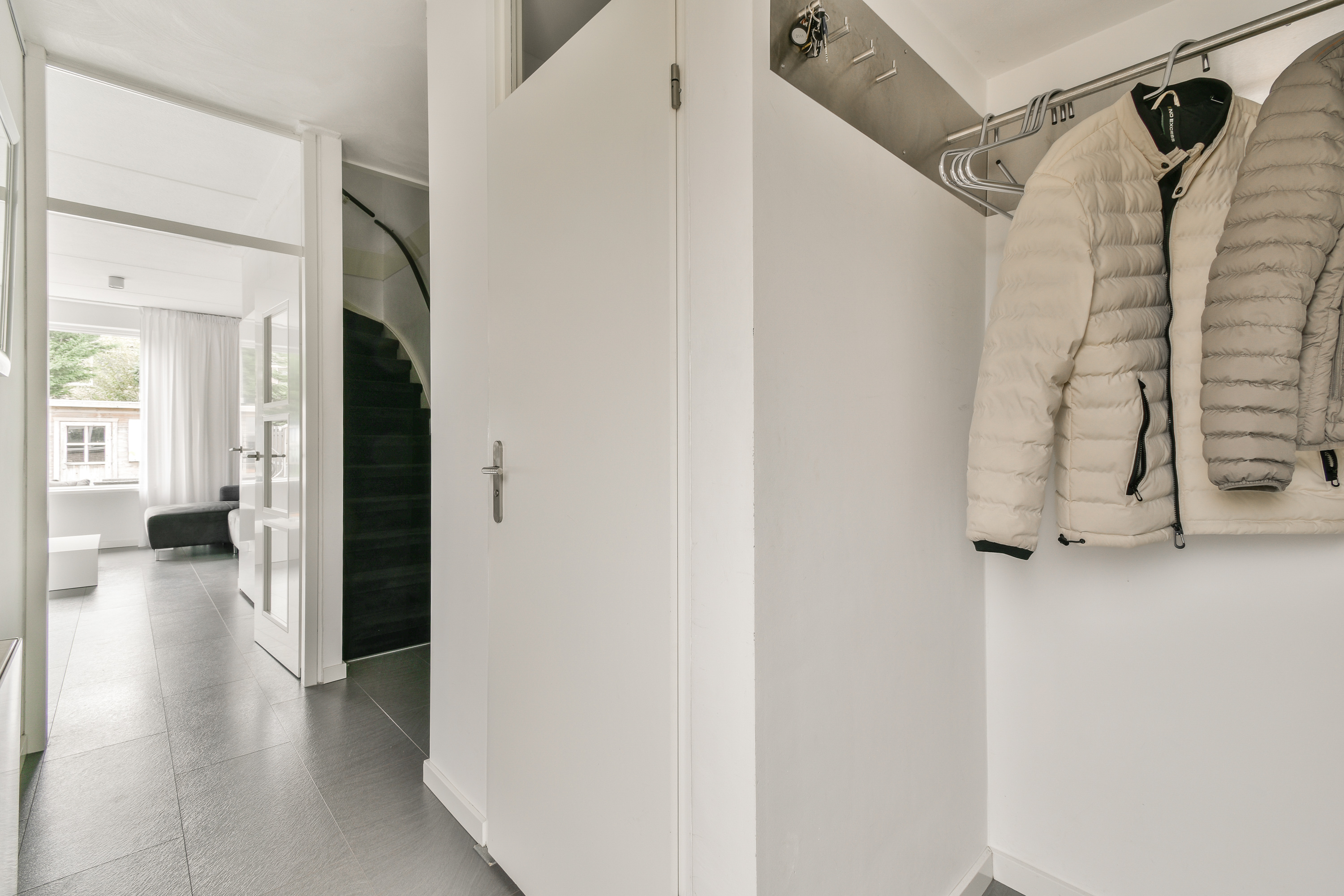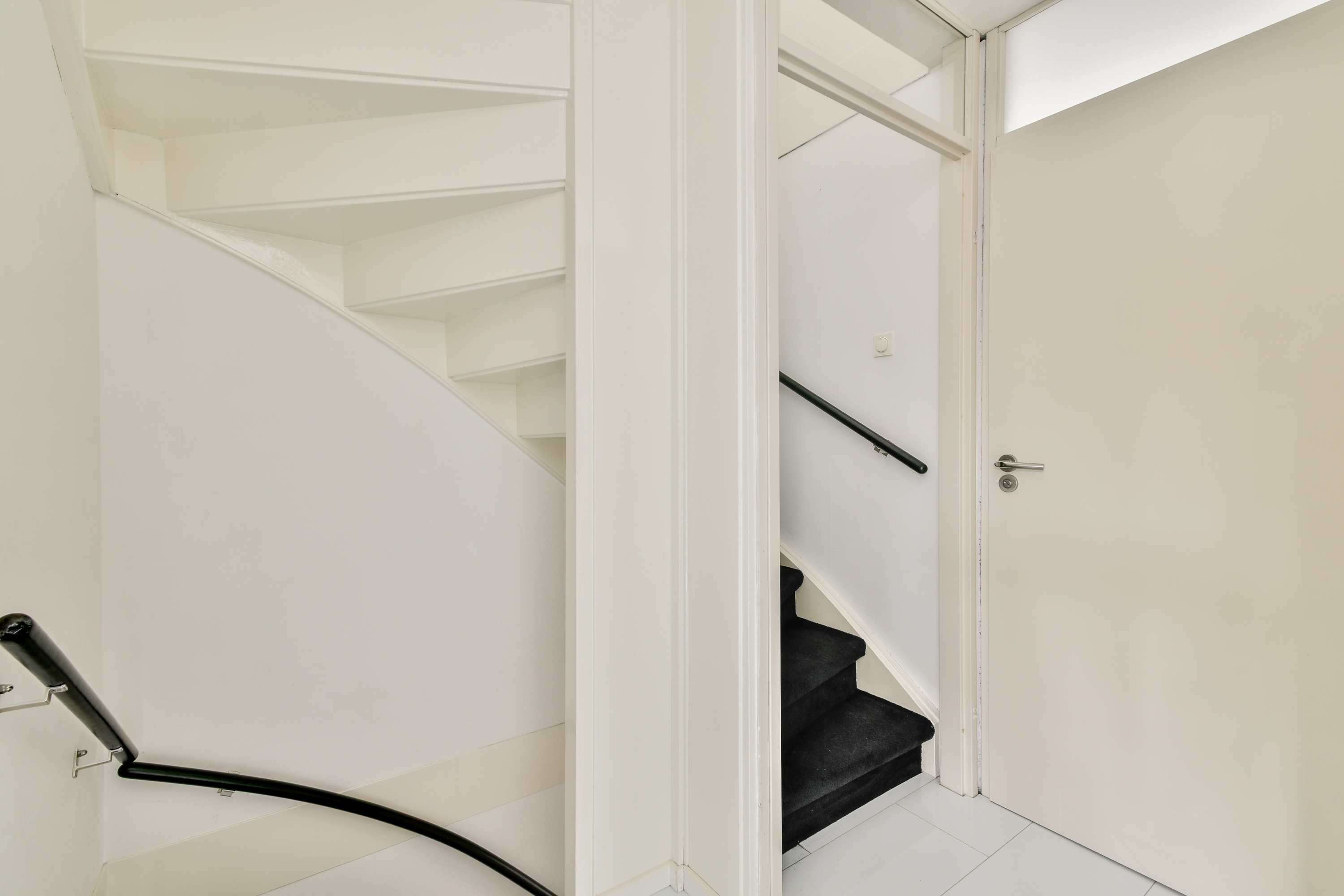 Upon entering, you step into a spacious hallway with enough room for a coat rack. From the hallway, you can access the modern separate toilet with a small sink, an internal storage room, the staircase to the first floor and the living room at the rear.