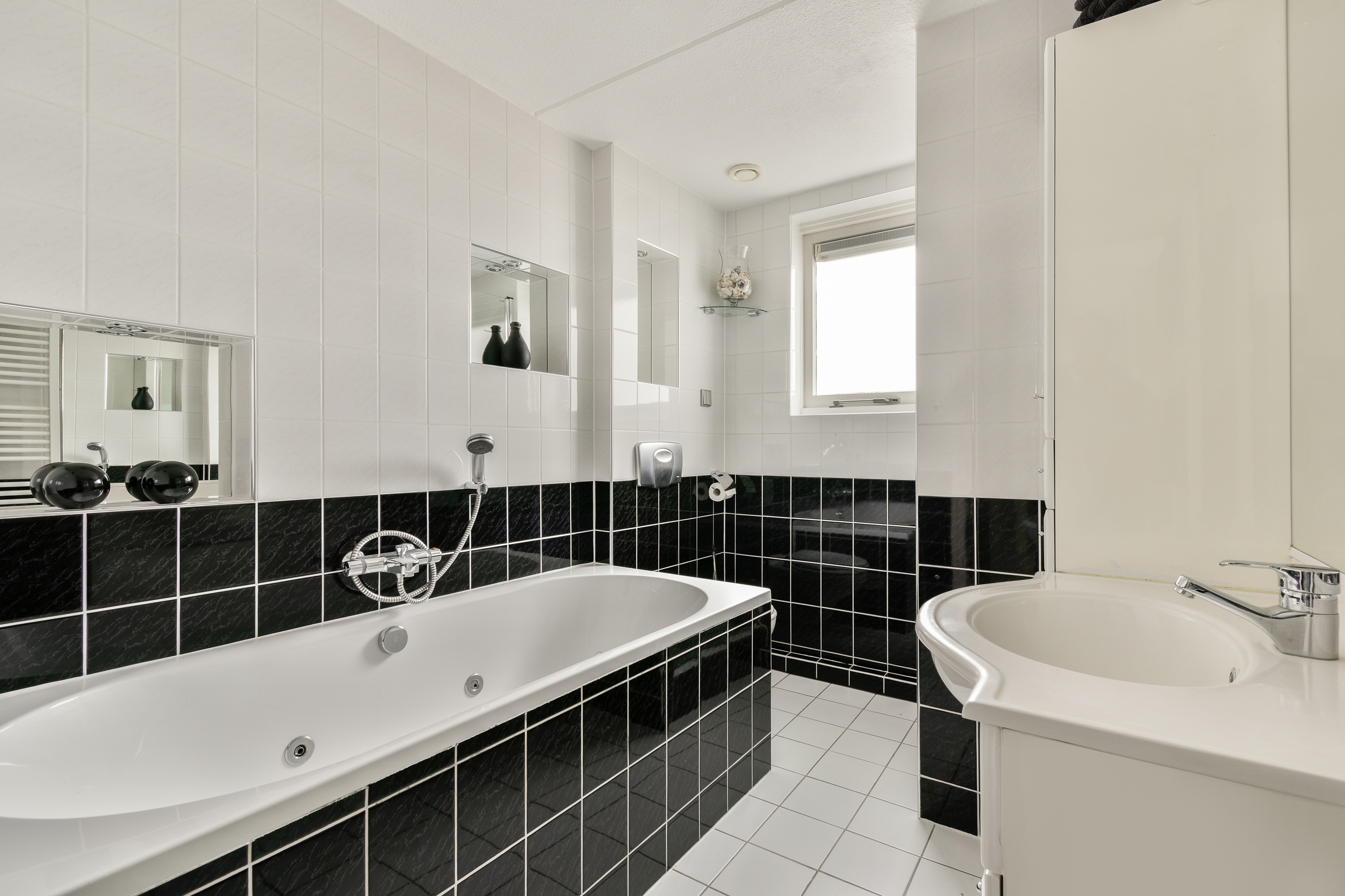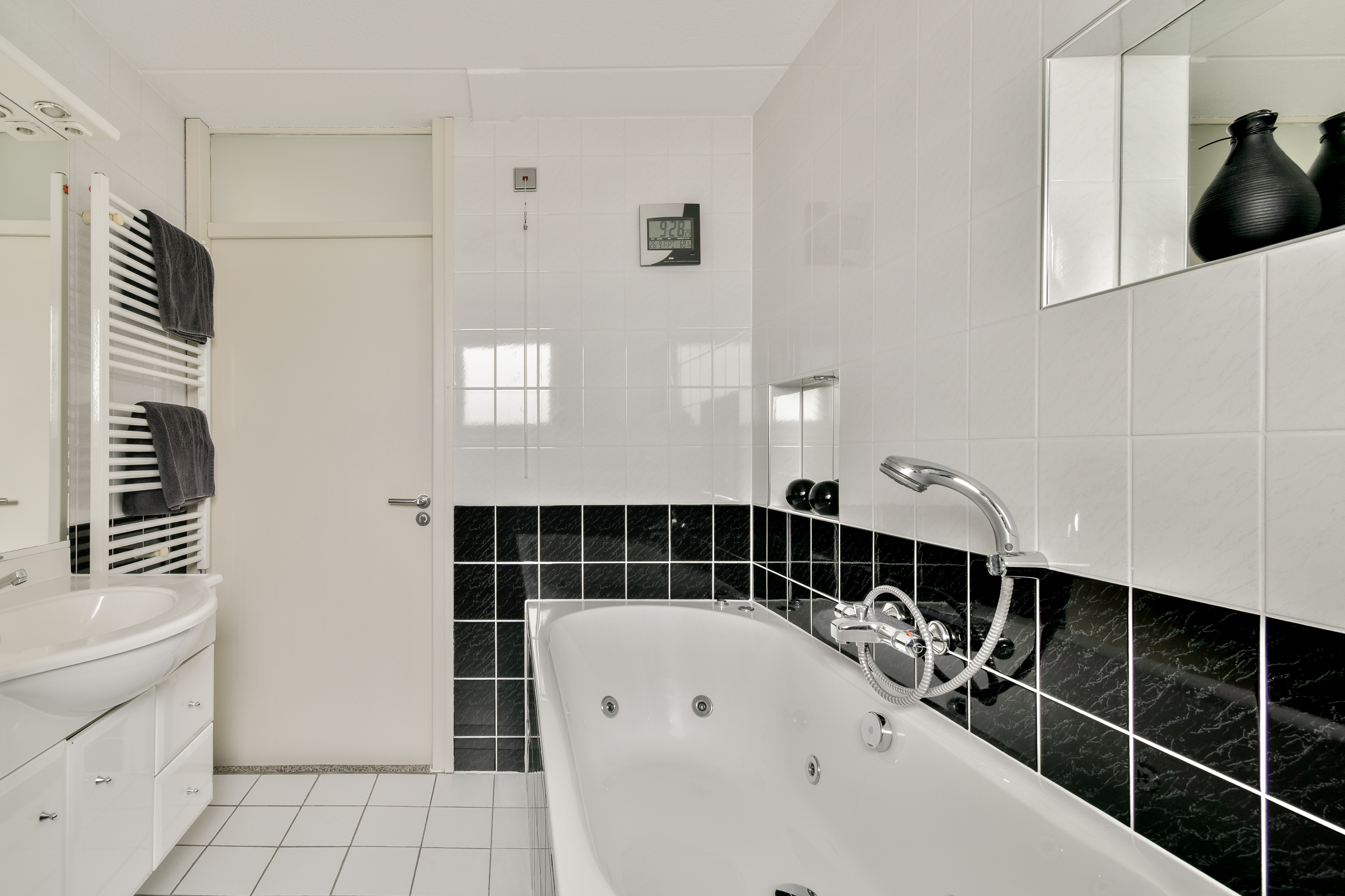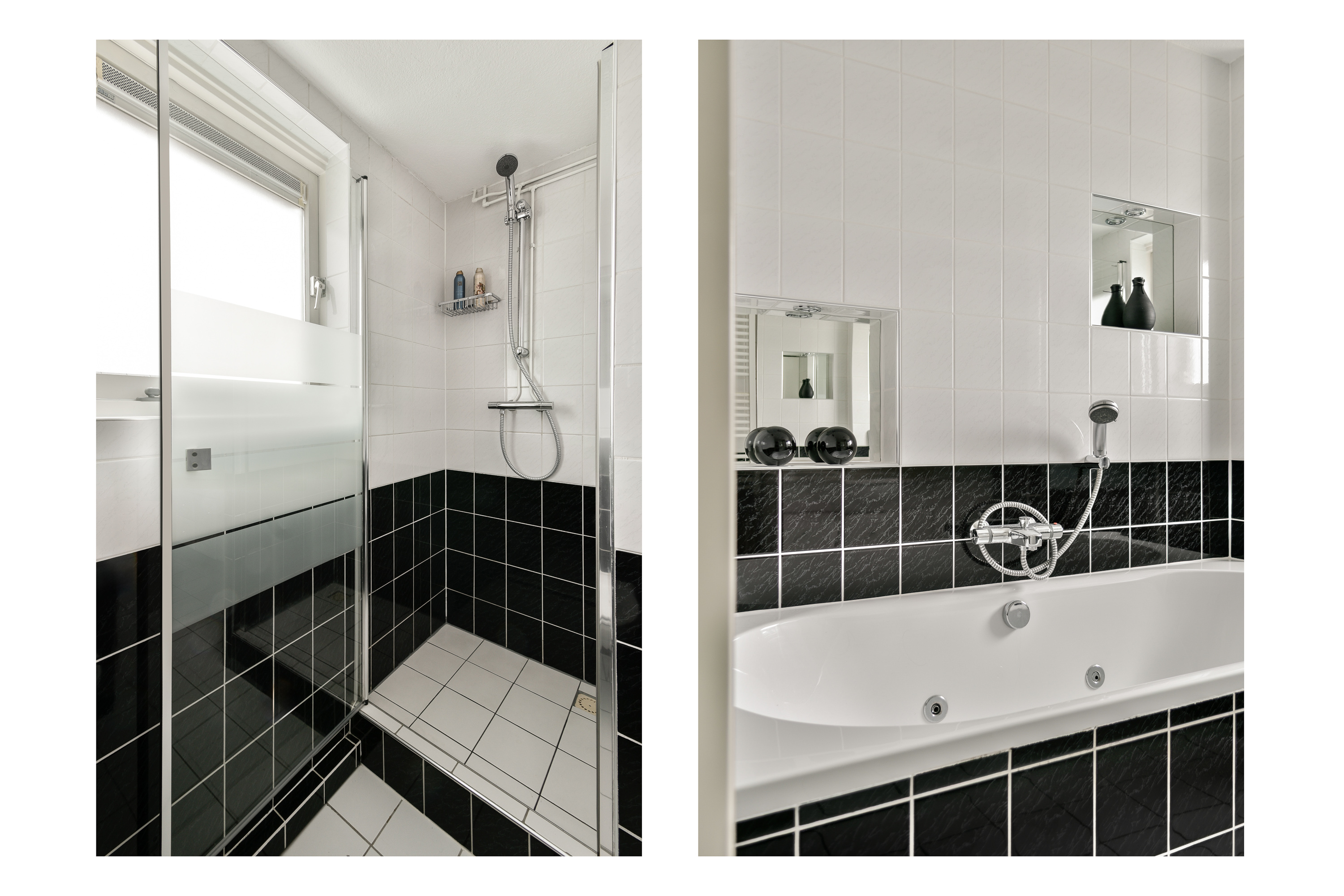 The landing provides access to all rooms. At the rear, there’s a spacious primary bedroom. This room can be divided into two separate bedrooms to create a fourth bedroom if desired. At the front, you'll find the second bedroom and the bathroom. The bathroom is finished with black-and-white tiles and features a Whirlpool bathtub, shower, sink with vanity unit, designer radiator and a floating toilet.