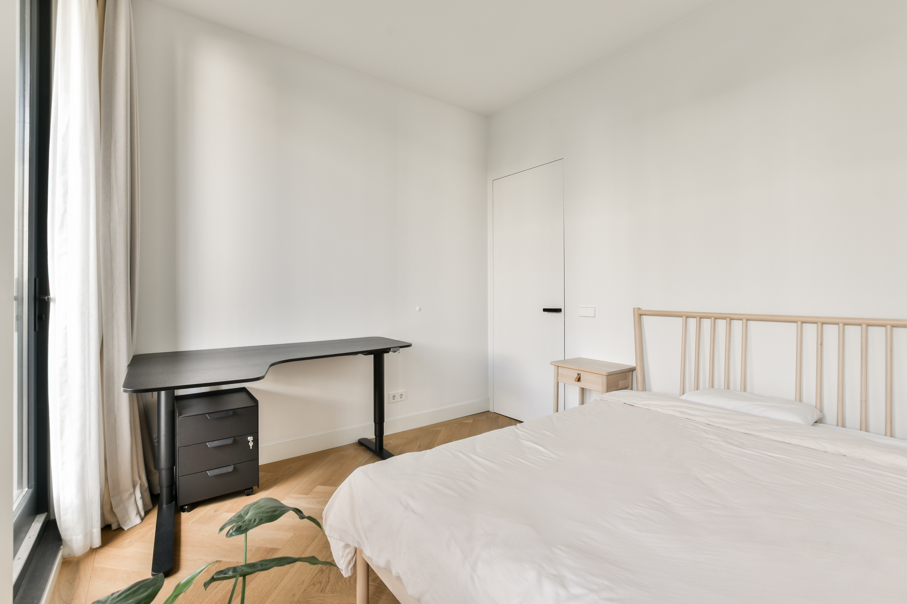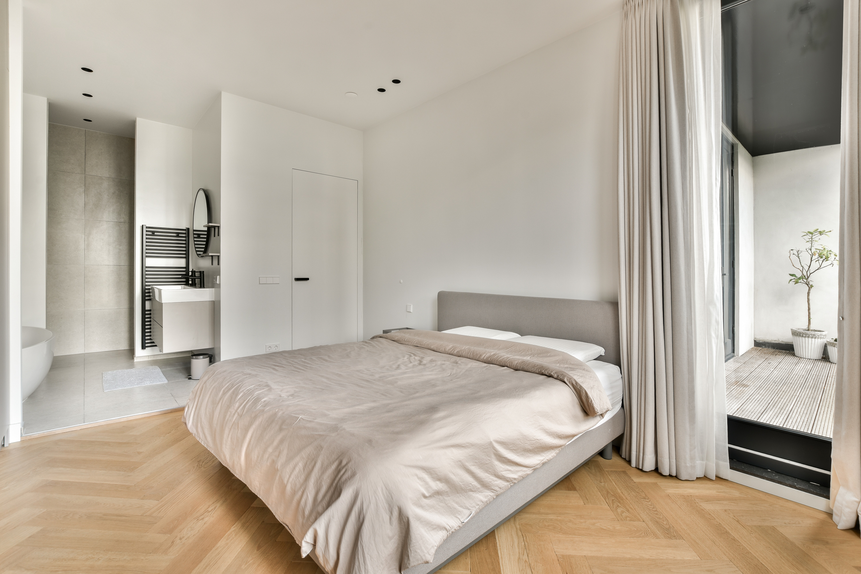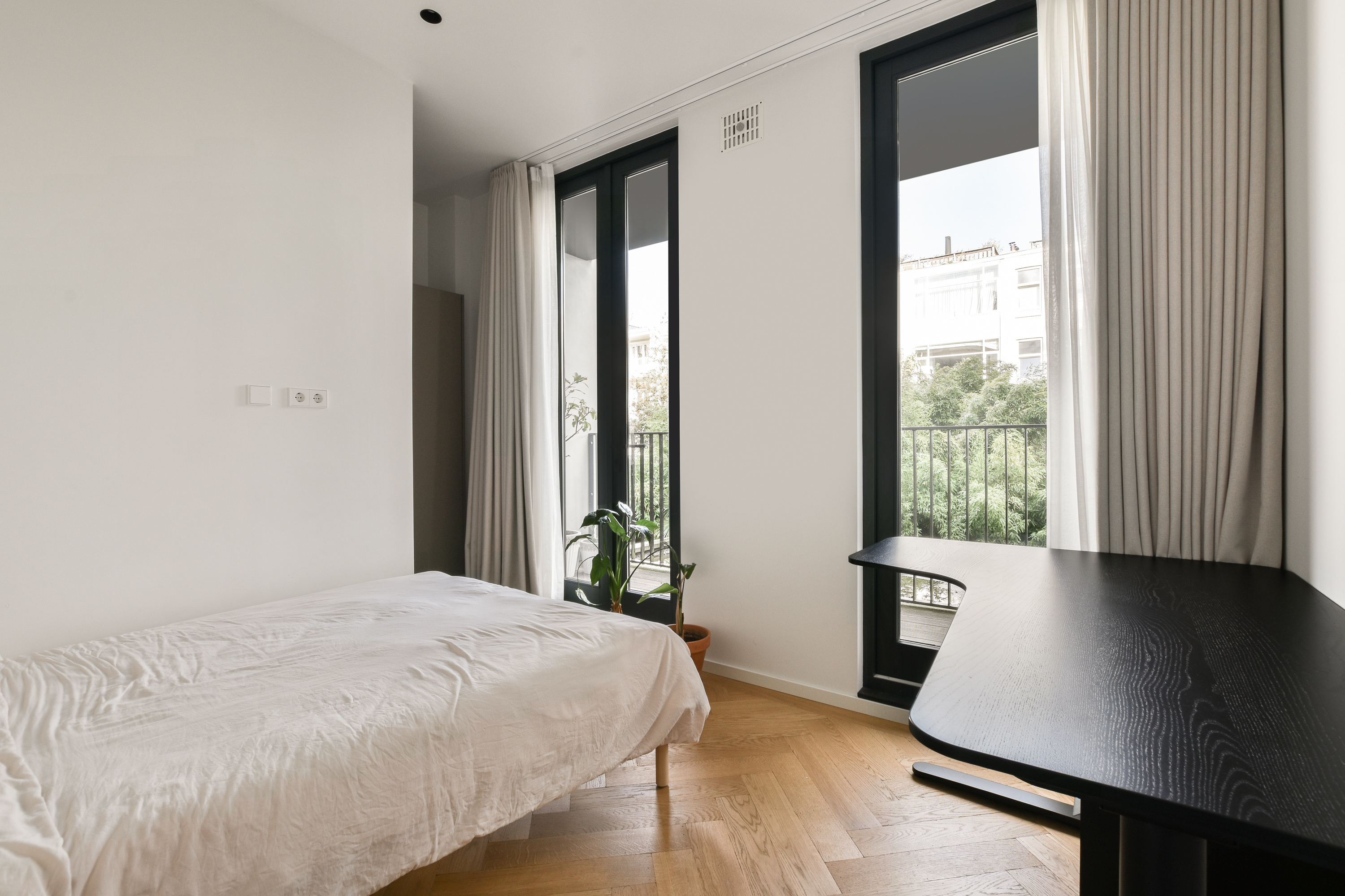 De tweede slaapkamer heeft ook openslaande deuren naar het balkon op het noordwesten en eveneens een eigen badkamer-en-suite met wastafel en inloopdouche.