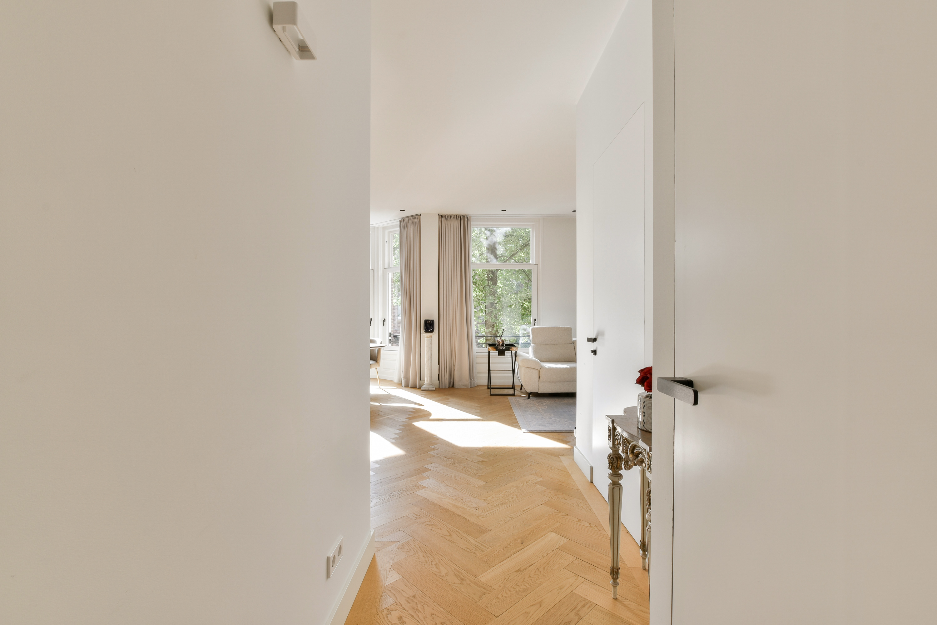 Via de stijlvolle gezamenlijke entree, deels uitgevoerd in marmer, bereikt u per lift of trappenhuis de tweede verdieping. De lift komt direct uit in de privéhal van het appartement, waar zich de meterkast, het separate toilet en de toegangen tot de woon- en slaapvertrekken bevinden.