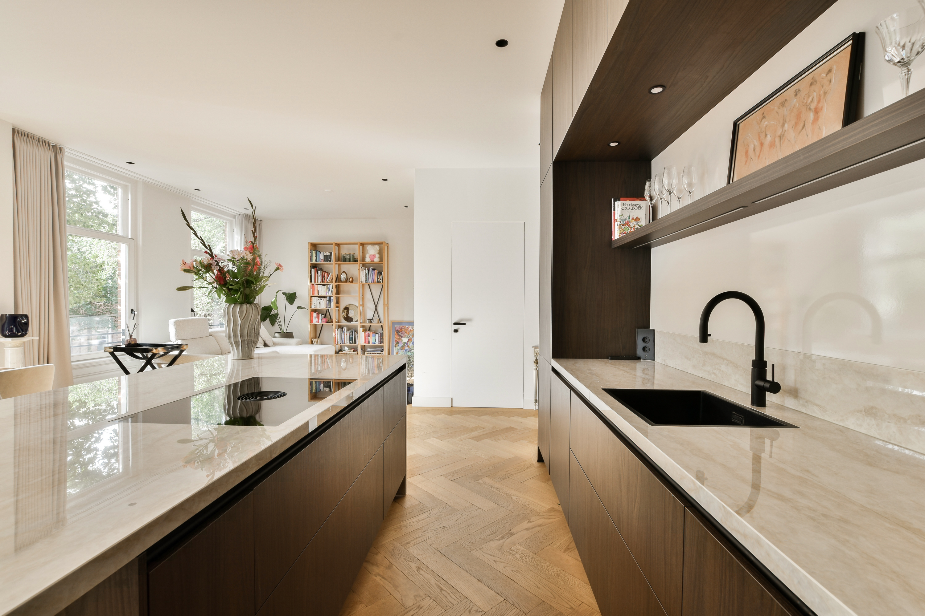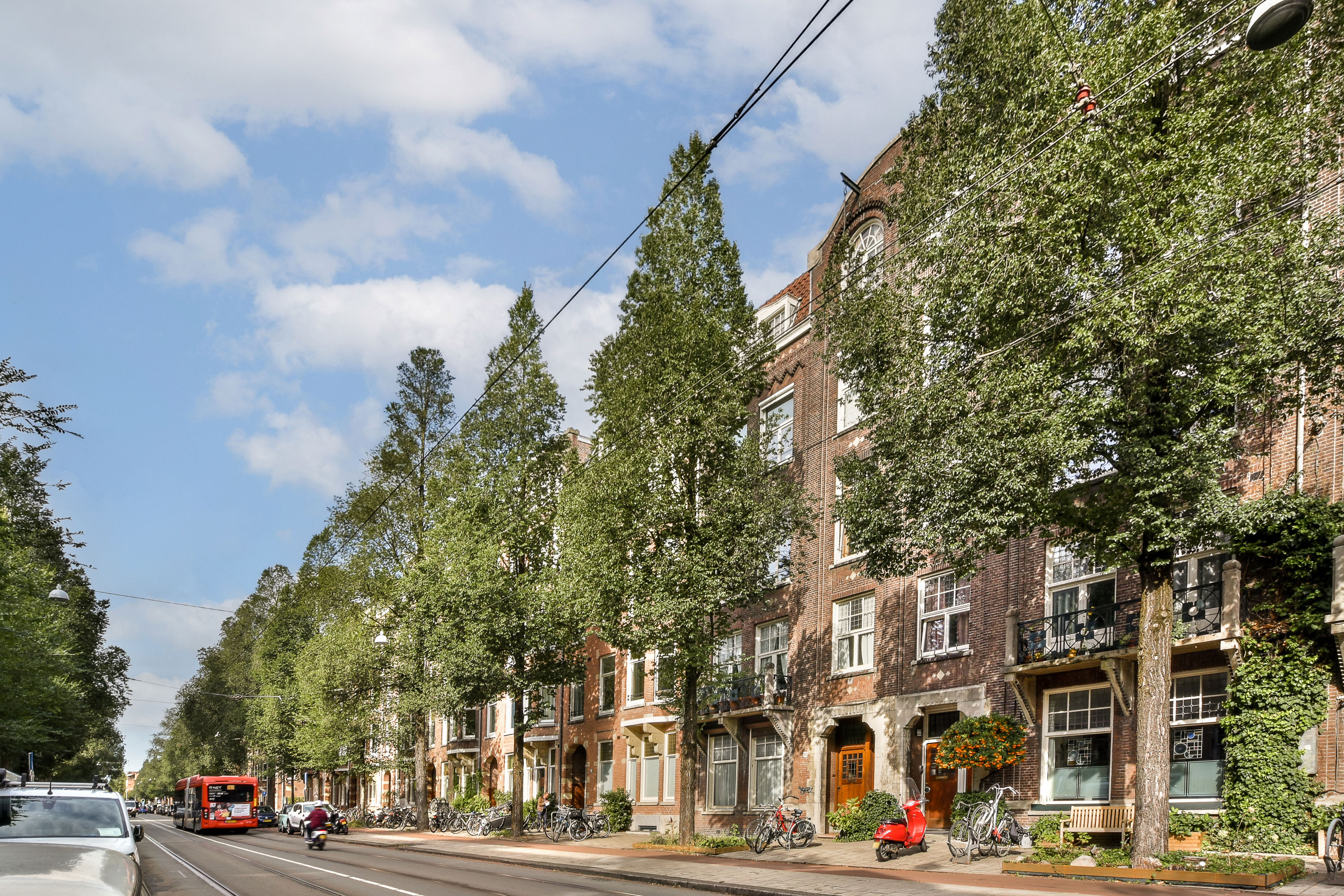De royale en lichte woonkamer is gelegen aan de voorzijde en beschikt over een karakteristieke erker met een fraai uitzicht over de De Lairessestraat. De moderne keuken met eiland is van alle inbouwapparatuur voorzien, zoals Quooker, oven, magnetron, (wijn)ijskast met aparte vriezer en vaatwasser.