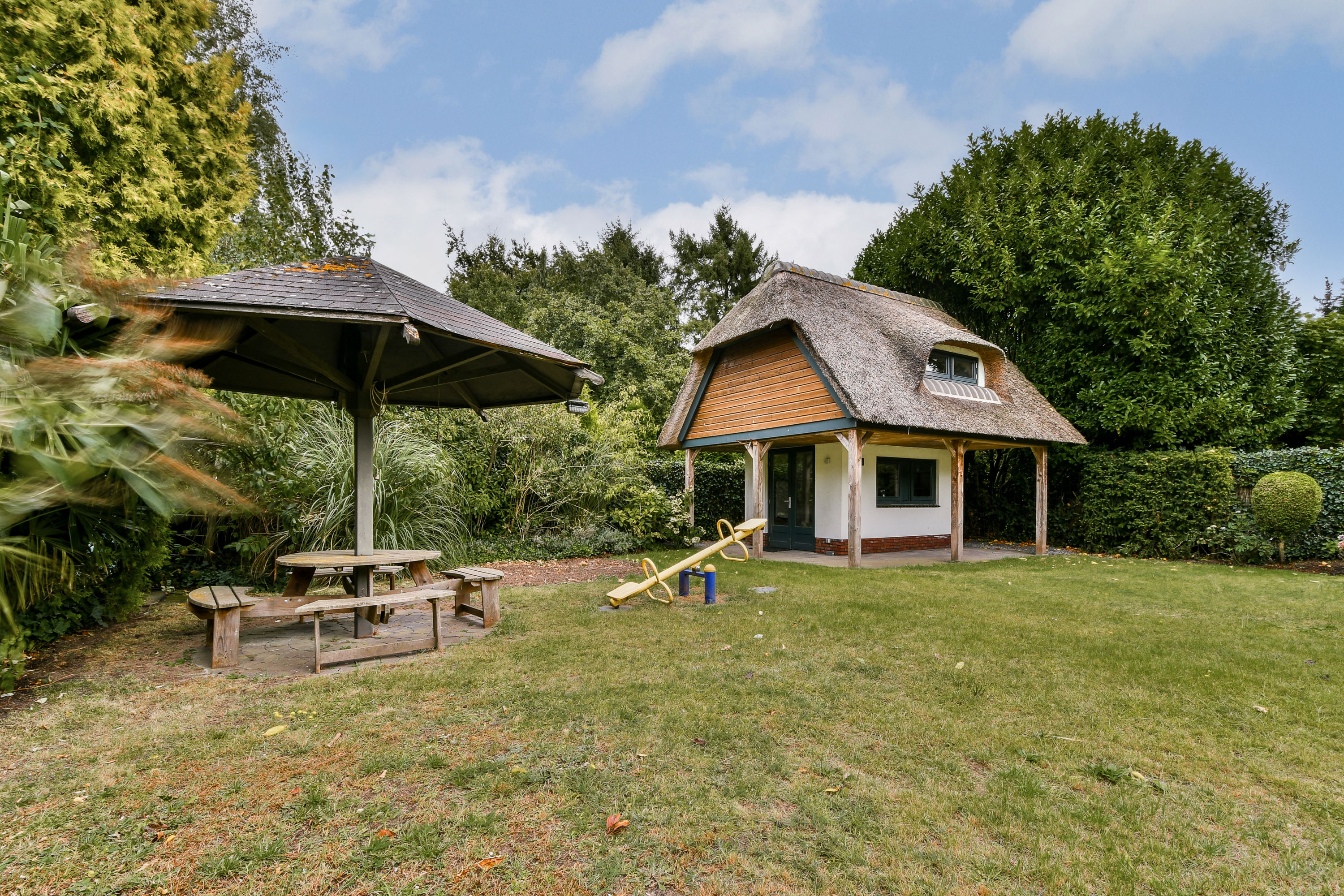 Achter in de tuin bevindt zich een charmante, eveneens riet-gedekte berging met royale veranda. Binnenin extra bergruimte met een vliering, bereikbaar via een vlizotrap.