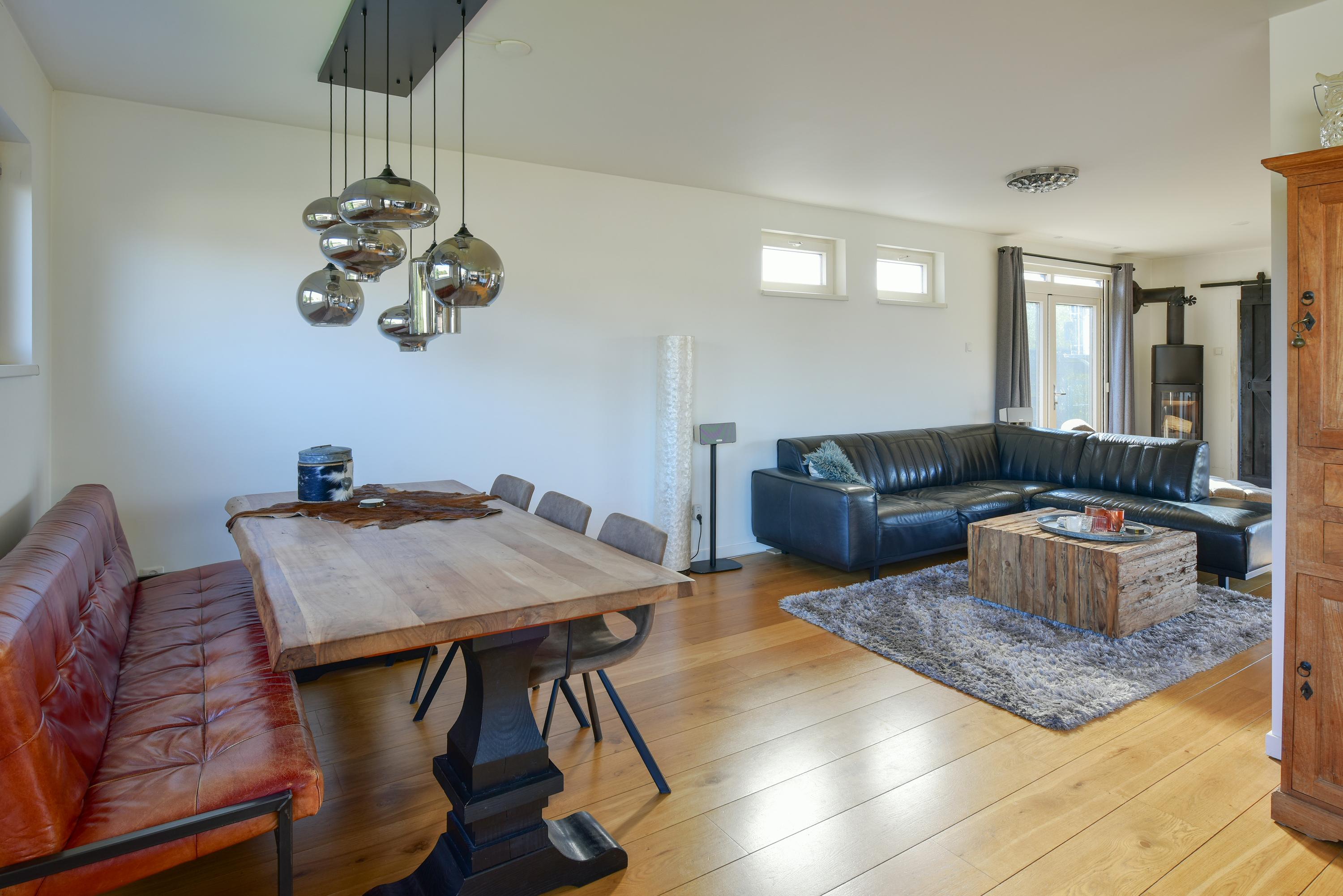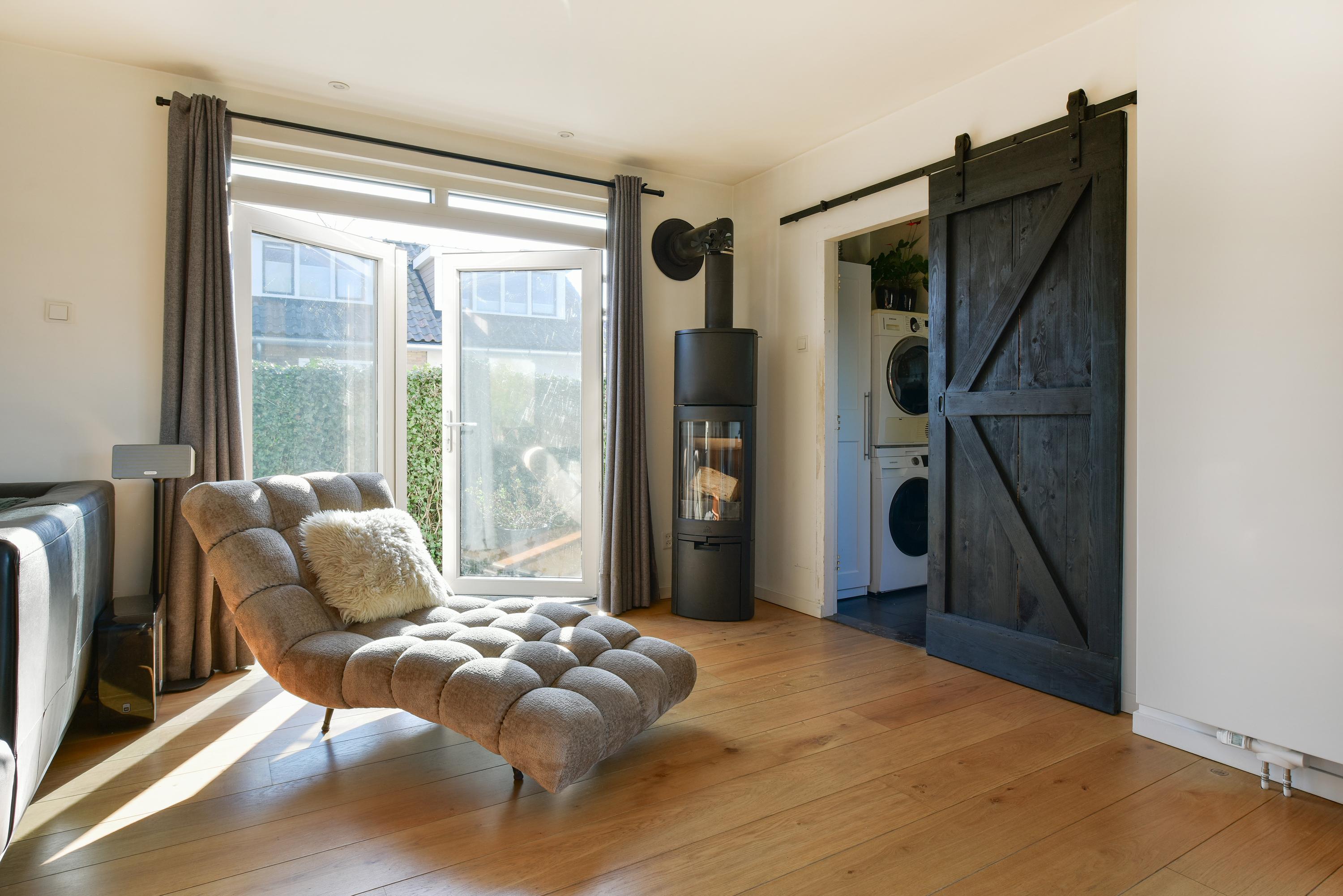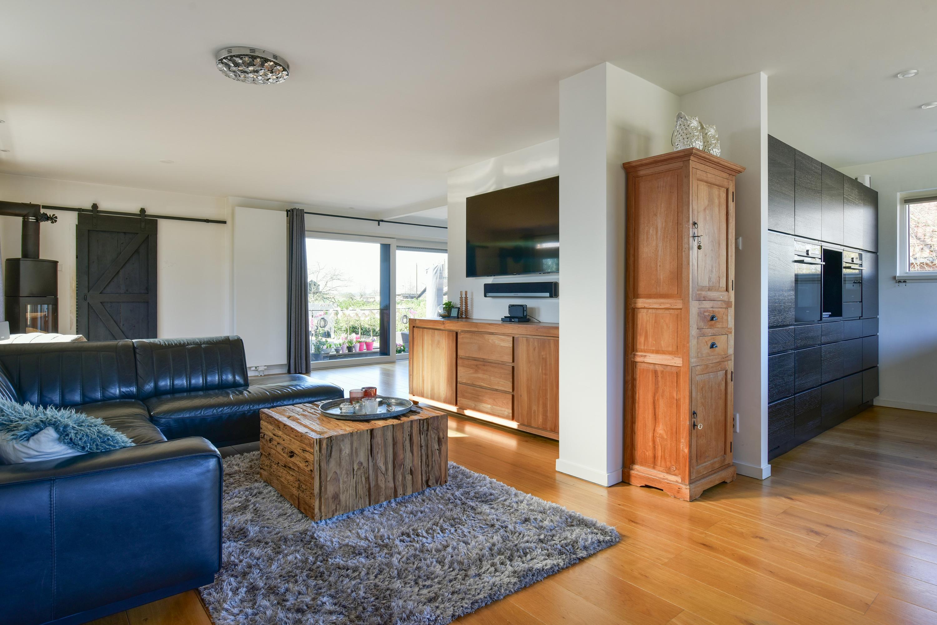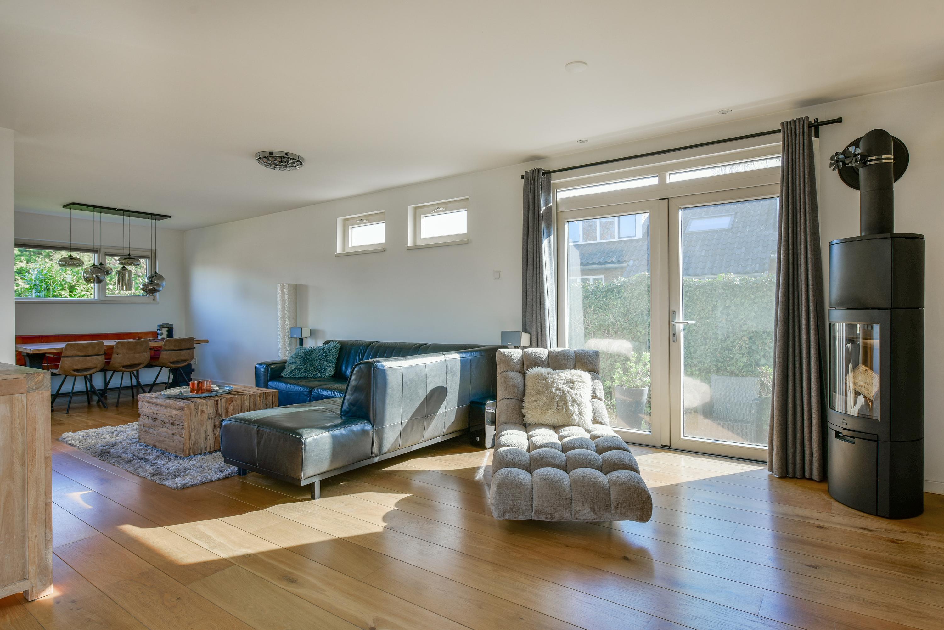 Royale U-vormige woonkamer met grote schuifpui naar de achtertuin, gesloten haard, deuren naar de zijtuin en een fraaie houten vloer. Bijkeuken met aansluiting wasmachine/droger.