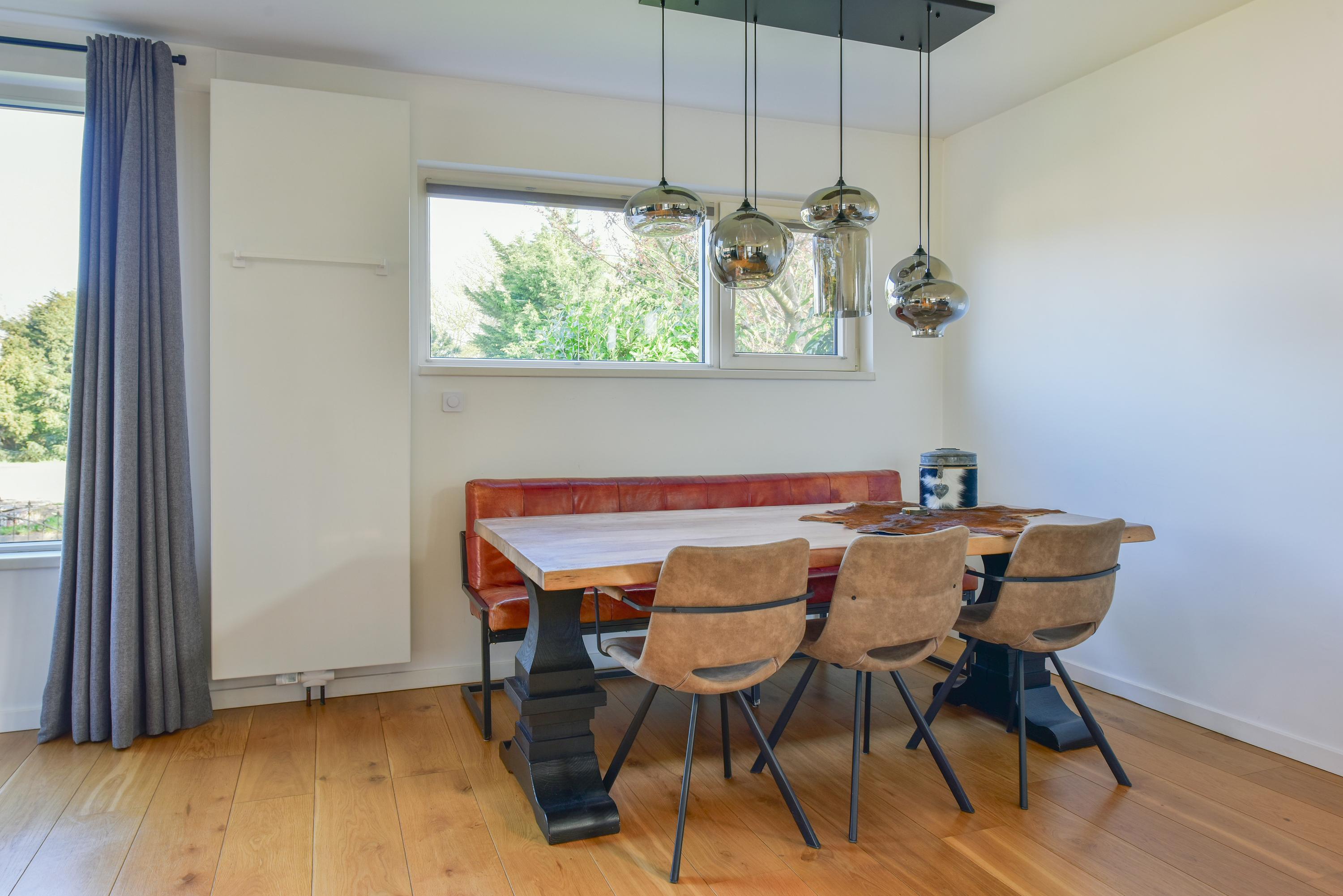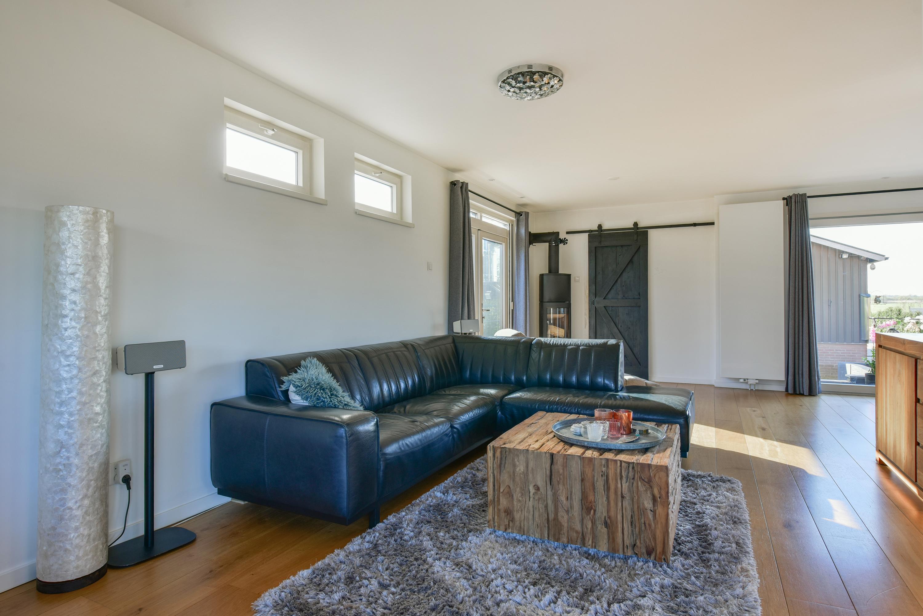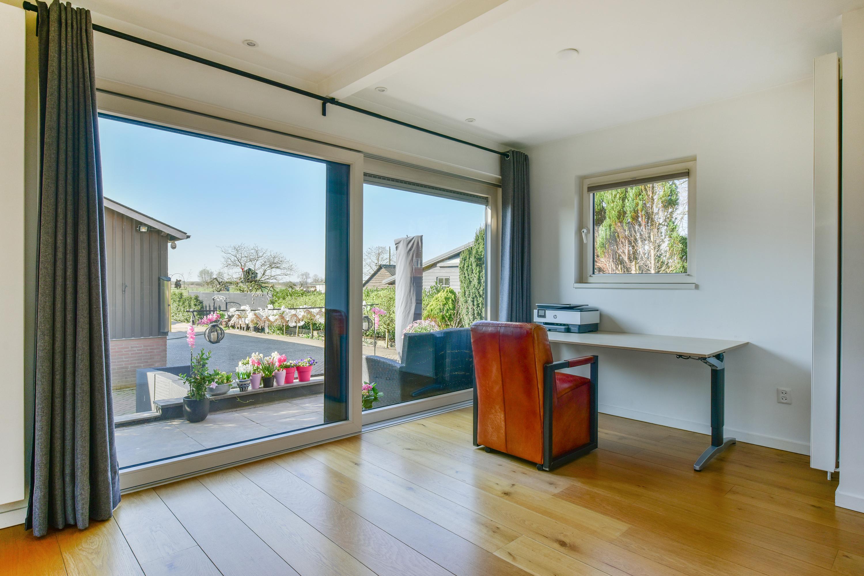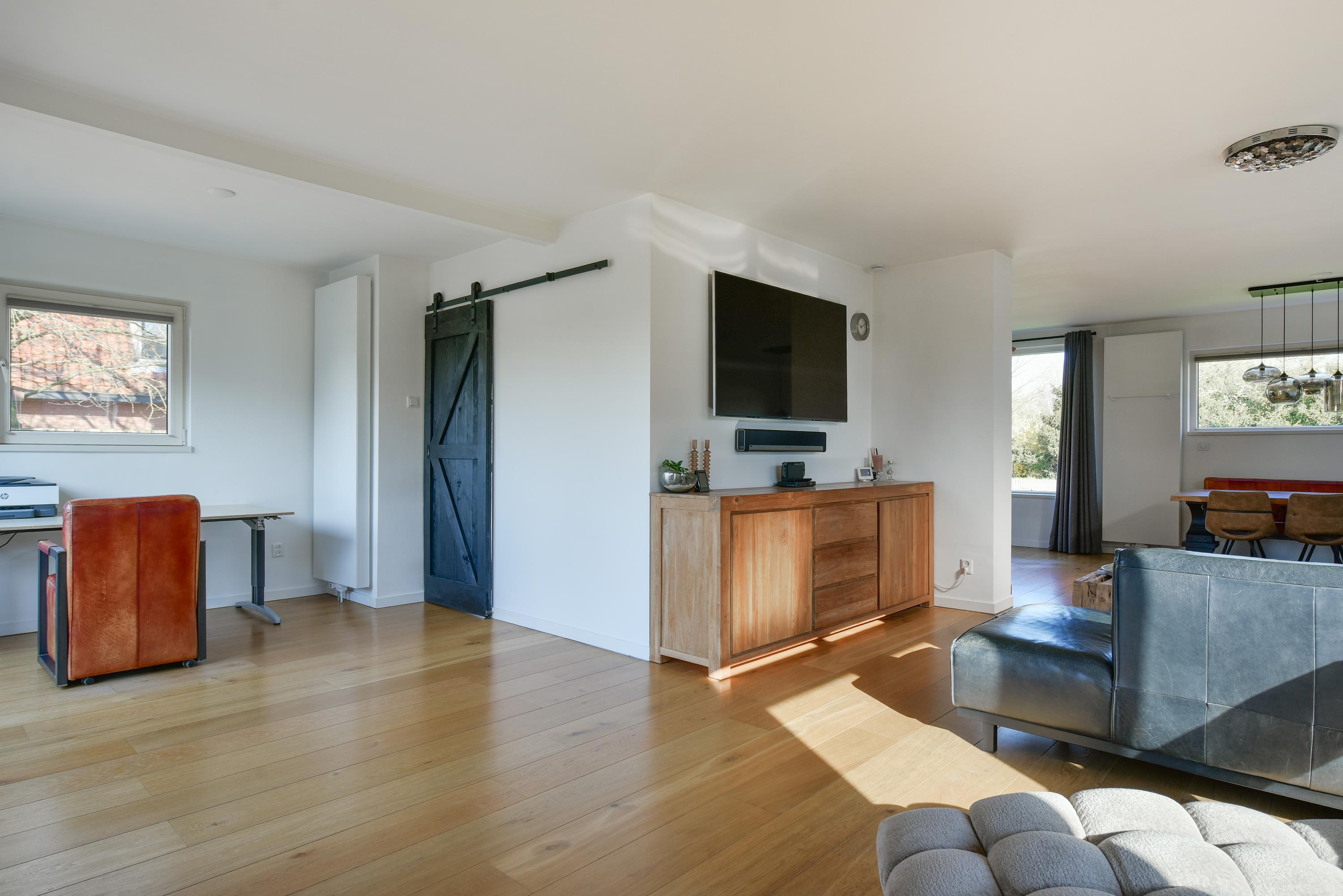 Royale U-vormige woonkamer met grote schuifpui naar de achtertuin, gesloten haard, deuren naar de zijtuin en een fraaie houten vloer. Bijkeuken met aansluiting wasmachine/droger.