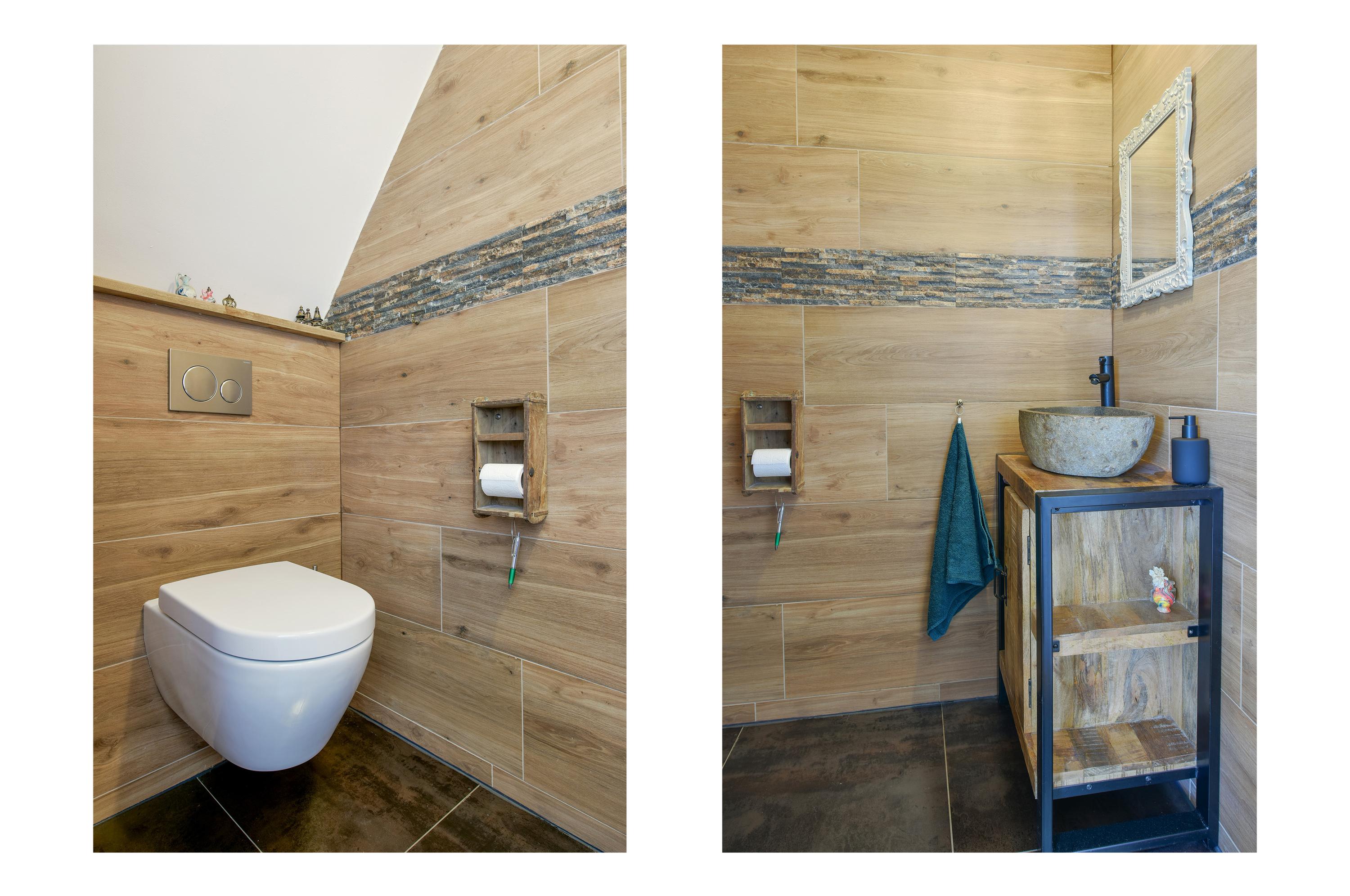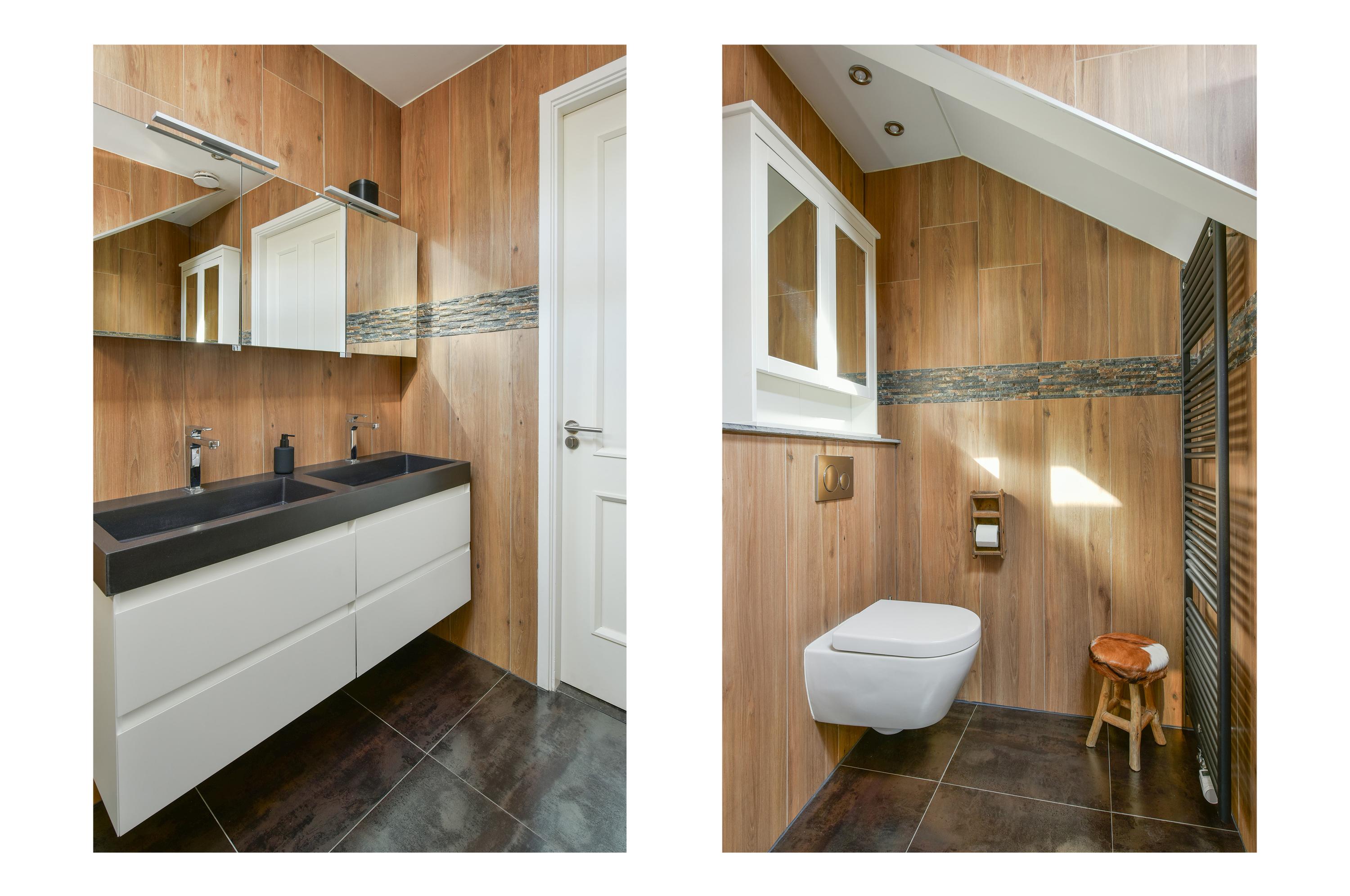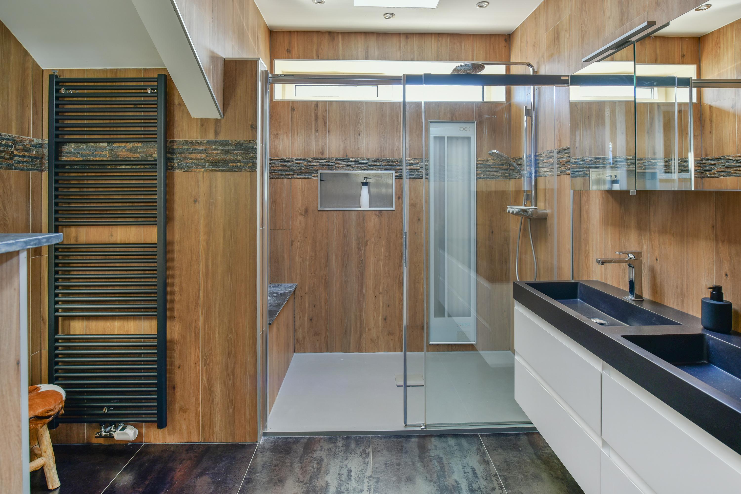 - Royale badkamer met inloopdouche en sunshower, dubbele wastafel en een toilet;