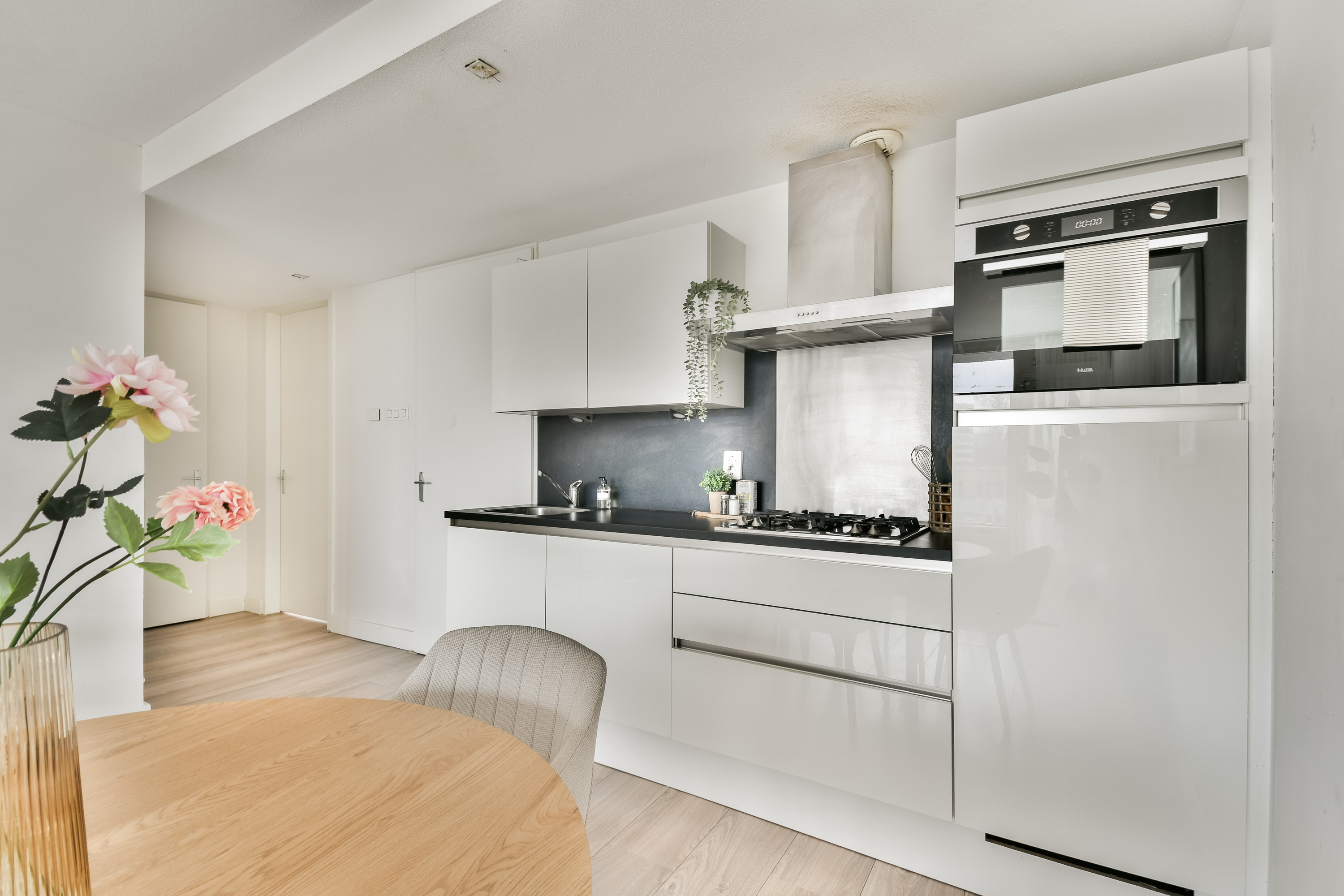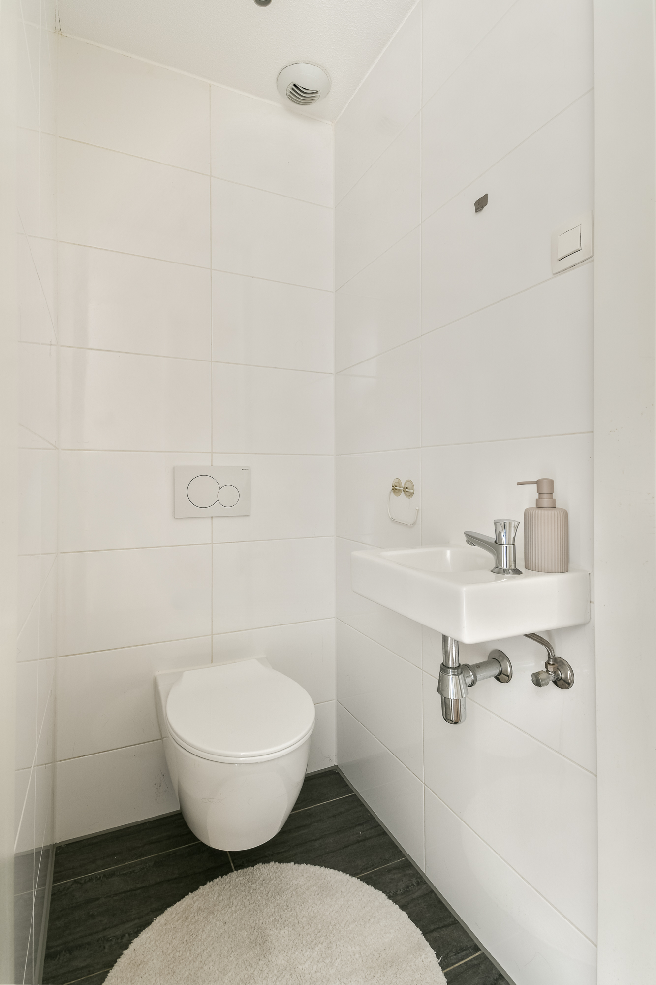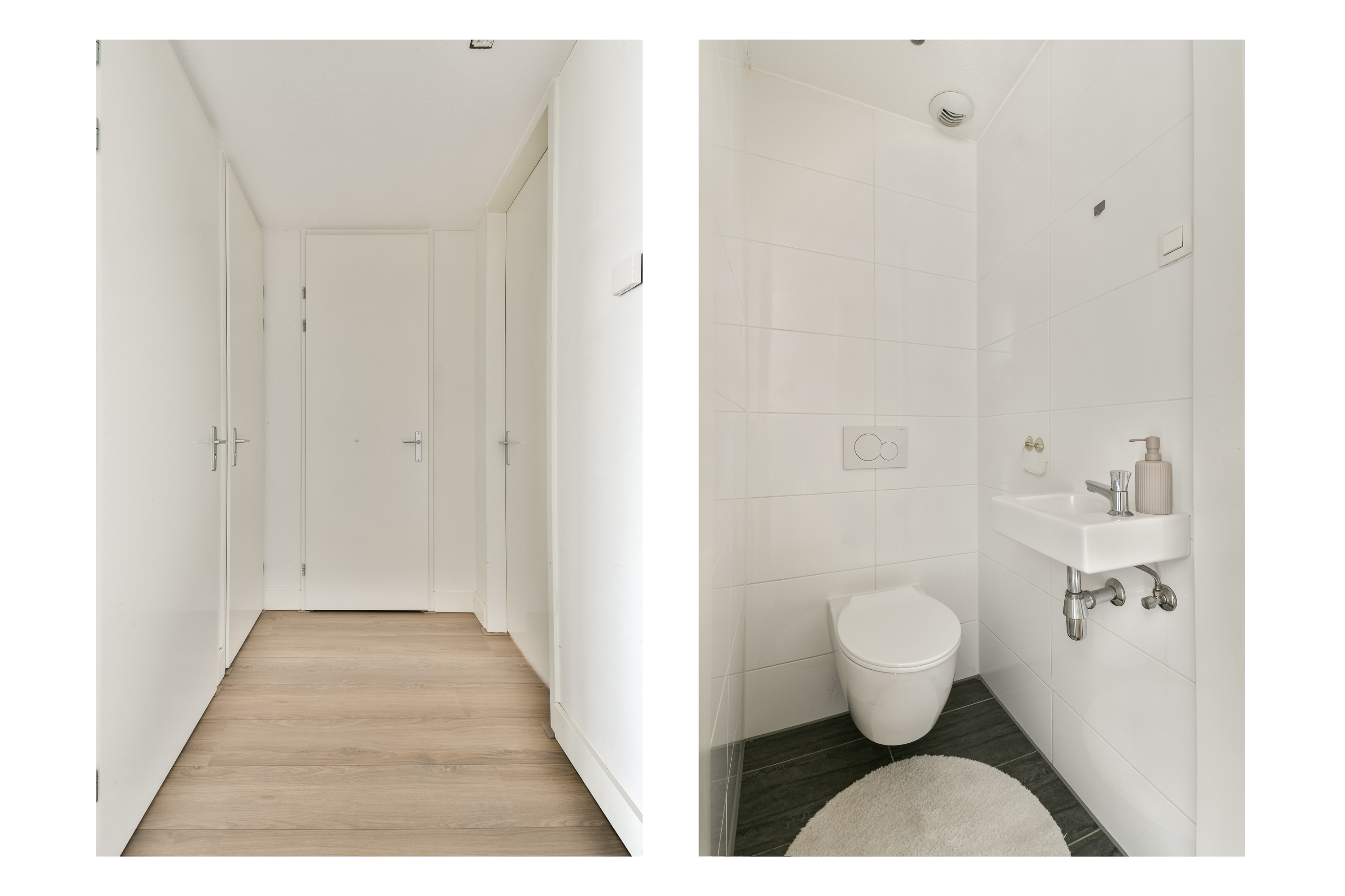 De hal, met een separaat toilet, biedt toegang tot alle vertrekken. Aan de voorzijde van de woning bevindt zich de ruime woonkamer met een moderne open keuken en balkon. Het zonnige balkon is gelegen op het zuiden. De keuken is uitgerust met een oven, een vaatwasser en een koelkast met een aparte vriezer.