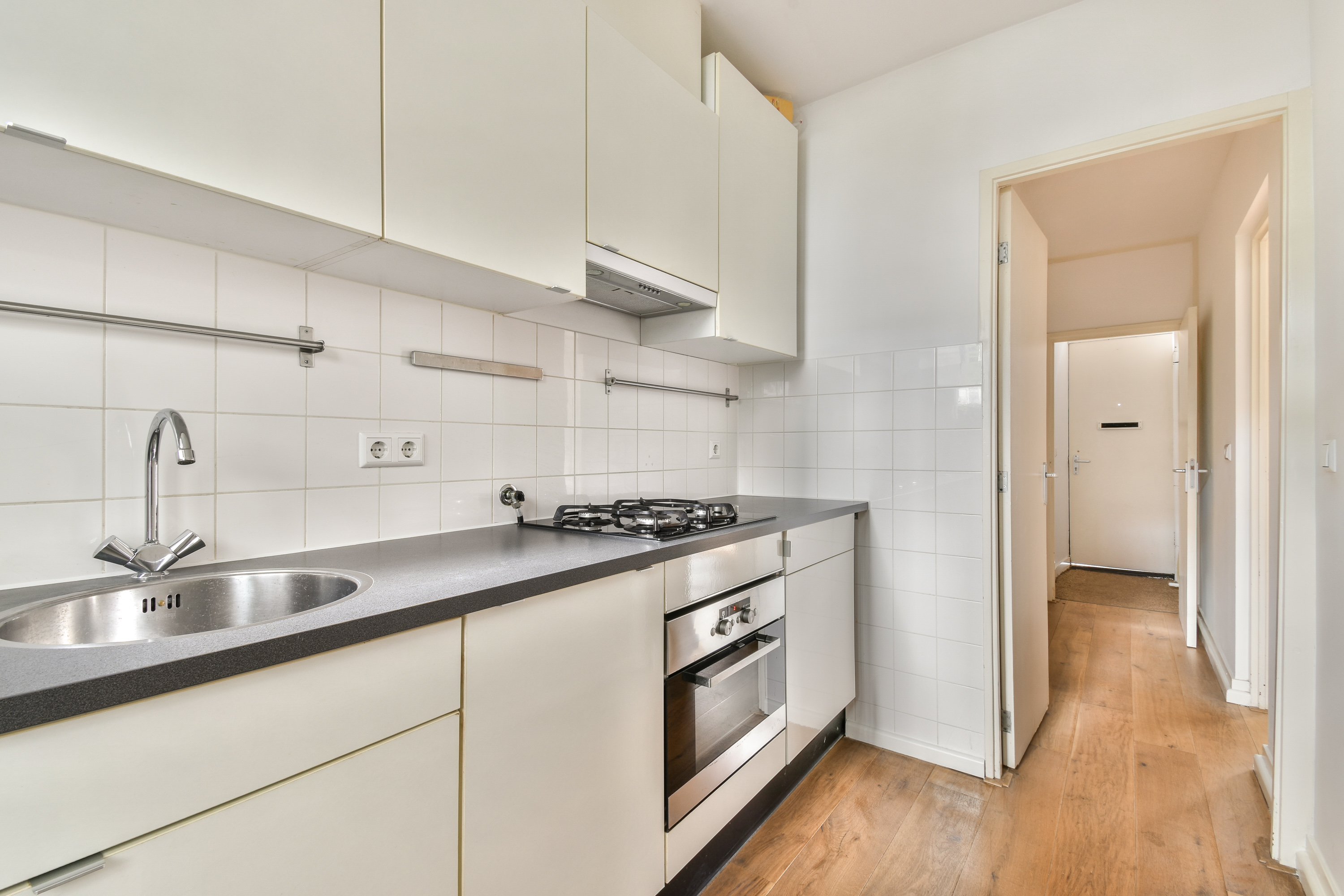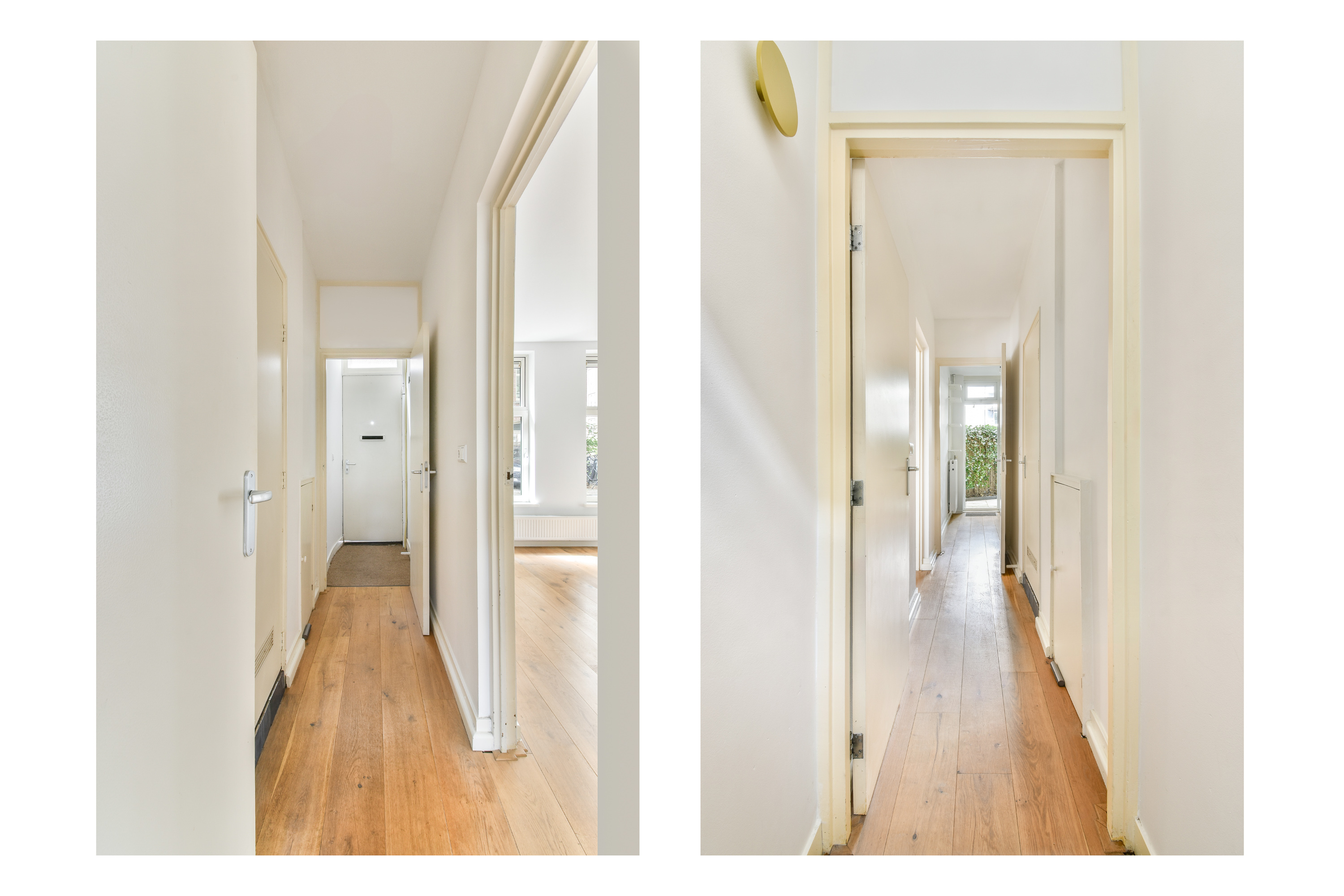 Via de eigen entree op de begane grond betreedt u dit charmante appartement. De hal leidt naar de lichte woonkamer aan de voorzijde, waar grote ramen zorgen voor een prettige hoeveelheid daglicht en een ruimtelijk gevoel.